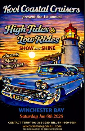Family fun event located in the heart of Winchester Bay. Show open to all make and year automobiles, 1st & 2nd class awards, pre-registration $15 closes Apr 30th day of reg $20 1st 100 entries guaranteed a goodie bag. Come enjoy some beautiful scenery and some cool cars.
