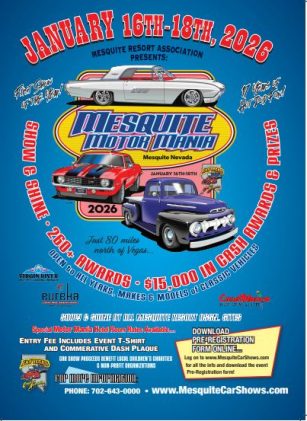 January16-18, 2026 Mesquite Motor Mania Car Show Mesquite, Nevada 89027 Information: www.MesquiteCarShows.com Phone: (702) 643-0000