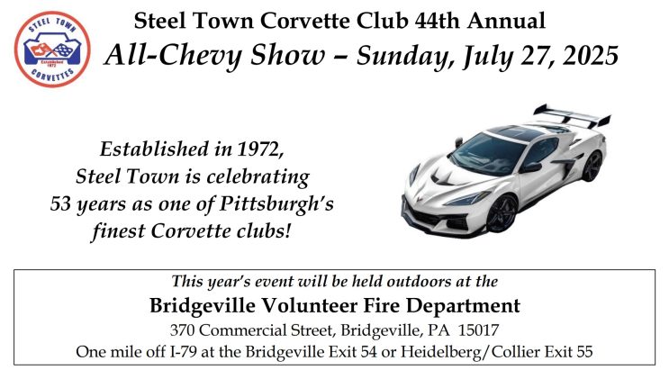 Celebrating its 53rd year, Steel Town Corvette Club announces the annual All-Chevy show. Colussy Chevrolet, the nation’s oldest family-owned Chevrolet dealership, will be sponsoring this event for the 44th time. Join us as we welcome all generations of Corvettes and many other Chevrolet classics to this year’s All-Chevy Show. This participant-judged event will feature 1st, 2nd, and 3rd place trophies in 18 categories along with “Best of Show” and “People’s Choice” awards. There will be a DJ and food trucks, door prizes, dash plaques, a Chinese Auction, 50/50 drawings and lottery raffles. Come join us, put your Chevrolet classic on display and enjoy the day. Proceeds benefit numerous local charities! $20 advance registration – $25 day of show (space permitting) – free spectator admission Visit https://steeltowncorvetteclub.com/all-chevy-show to download form to pre-register.