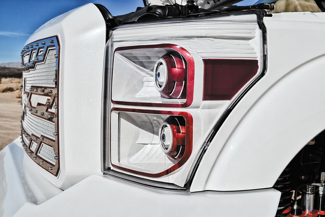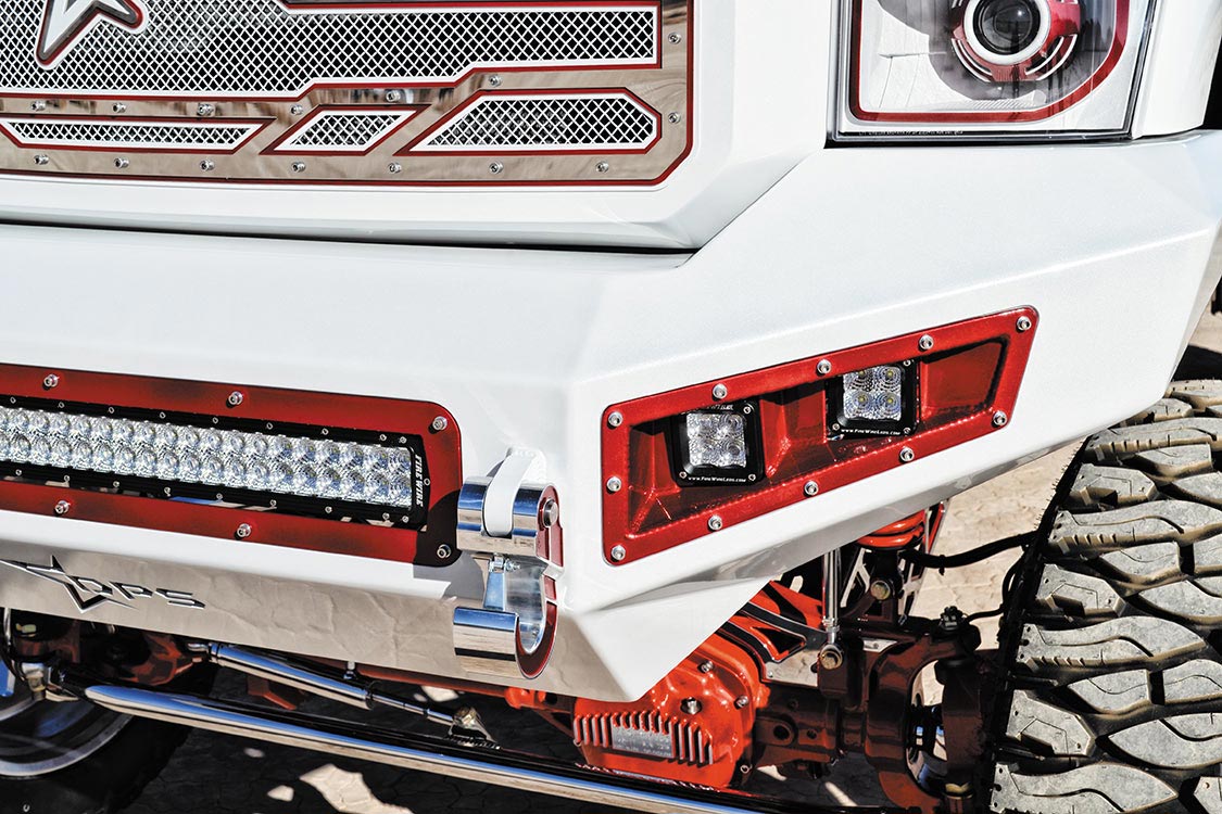 Even with the skeleton of the truck finished (body and frame) there was still a ton of work left. Trevor was determined to have a drivable truck as well as a show truck, so they made lots of unseen changes, like re-gearing the front and rear axles with 4.88 gears, to help get the 11,000 pound ride moving. As the build went along, anything that wasn’t already painted white was either powder coated or chromed, including the entire underside of the truck. This meant the frame, axles, and suspension links would all become works of art, in addition to the custom crossover steering with PSC hydraulic assist.
