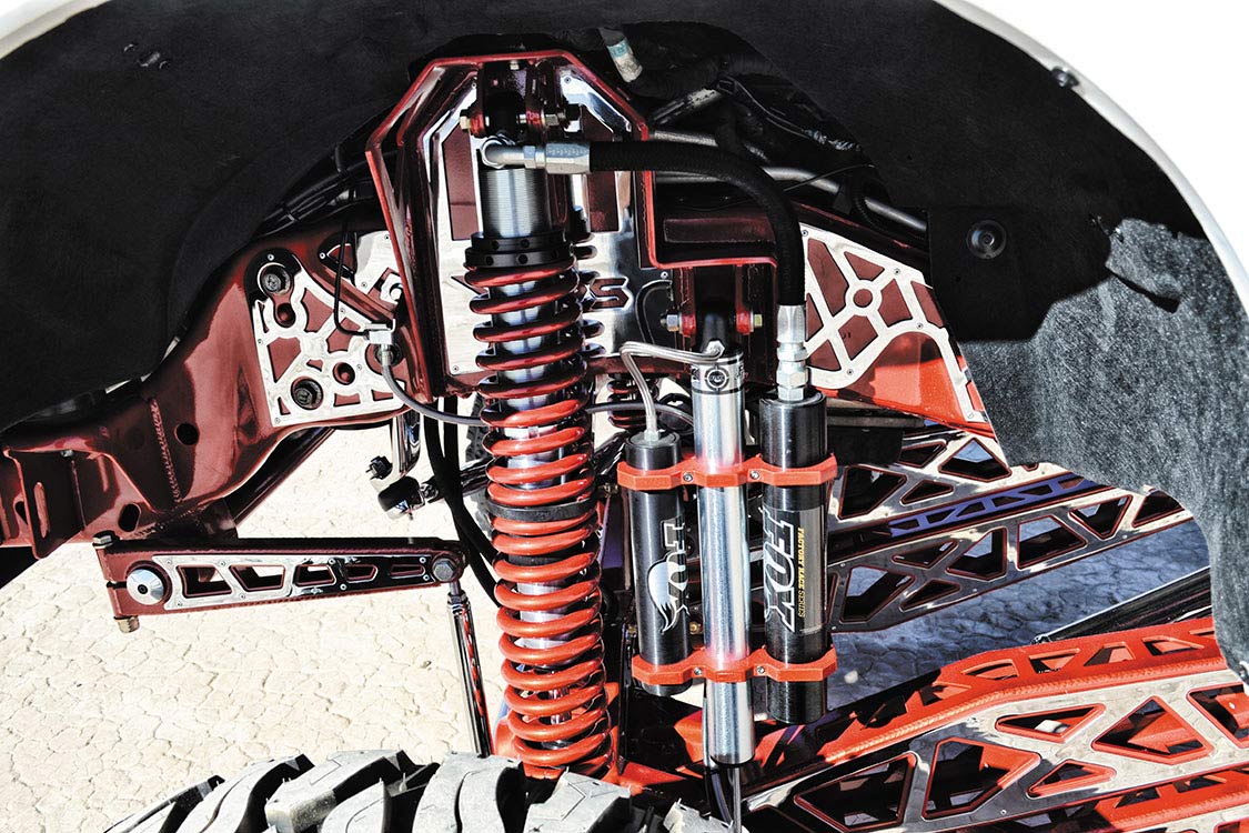 Other than the body modifications, the bulk of the work definitely went into creating the wild 20 inches of lift that firmly sets the truck into the sky. Gone are the factory leaf springs, and instead the Excursion rides on Fox Racing coil-over shocks all the way around, that have a mammoth 14 inches of travel. The front Dana 60 axle and rear Sterling 10.5 are both hung by wildly unique rectangular 4-link suspension arms, that are also powder coated and chrome-plated. AMP Research Powersteps were also added so that passengers could actually climb into the Ford, and braided stainless brake lines were used because of the suspension’s immense travel.