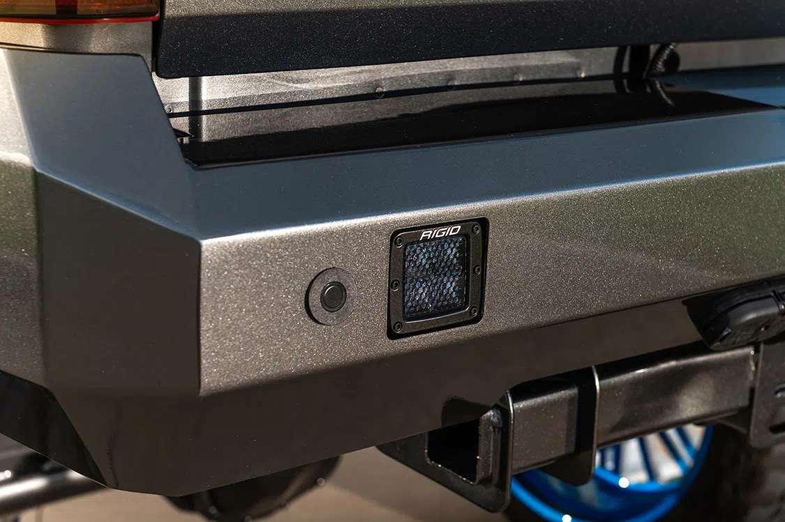 With Parker’s Ford standing tall and looking tough, there was still some room left for improving upon its rugged appearance. At the front end, blacked out Morimoto LED headlights were included, as was a hardcore grille with an integrated light bar from Royalty Core. A Fusion bumper loaded with Rigid Industries pod lights were also bolted up to drastically change up the demeanor of the truck’s front side.