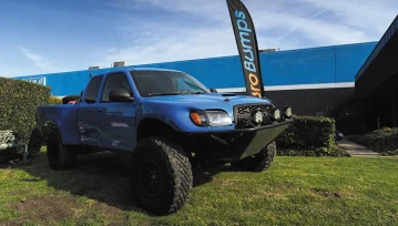 While a good deal of bolt-on suspension components are present underneath Parker’s Ford, it also has an equal amount of precision fabrication and artful welding that was sunk into this project to attain the 28-inch suspension lift. Highway 20 Collision of Claremore, Oklahoma, stepped in once it was all done to coat the chassis system in Candy Blue paint to make the fabrication handiwork really pop. There is definitely a lot to look at as far as the new suspension setup is concerned. From the RadFlo coilovers, chromed-out exhaust system, and all the one-off custom fab work, the fellas at Auto Definitions had a lot to celebrate about the progress thus far.