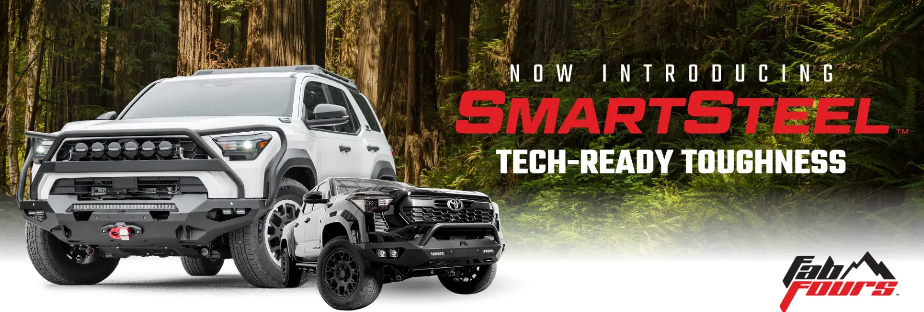 SmartSteel bumpers are currently available for the 2025+ Toyota 4-Runner and the 2024+ Toyota Tacoma. Fab Fours will also work to include SmartSteel in future front and rear bumper launches. Customers looking to see which Fab Fours bumpers are ADAS compatible should look for the new SmartSteel badge on product pages and future materials.
