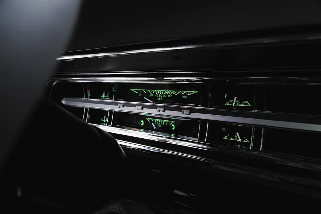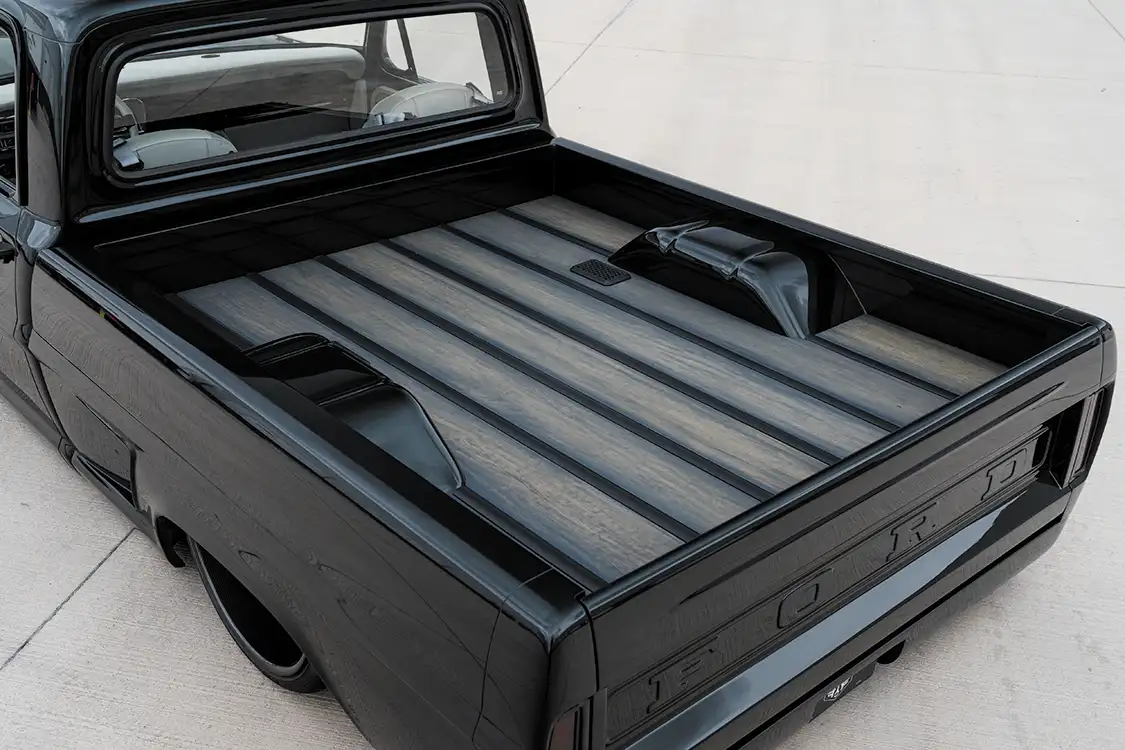 The Bullitt F-100 has been treated to minimal exterior alterations, but the design cues that it does have, from the scoops on the bed sides and the full-custom hood and sharpened body lines to the reimagined grille and front bumper, are closely reminiscent of the 1968 Mustang GT portrayed onscreen. Even the dark green paint harkens back to the color of the original car. To add modern flair to the vintage truck’s restyling, FFG’s own Cerakoted door handles were utilized, as were stealthily mounted LED taillight housings. Since the truck is obviously a lot lower than factory ride height, the bed floor had to be raised. While doing that, the sheetmetal floor was converted to a one-off wood plank surface that features a motorized center section that lifts, revealing a very special vantage point.