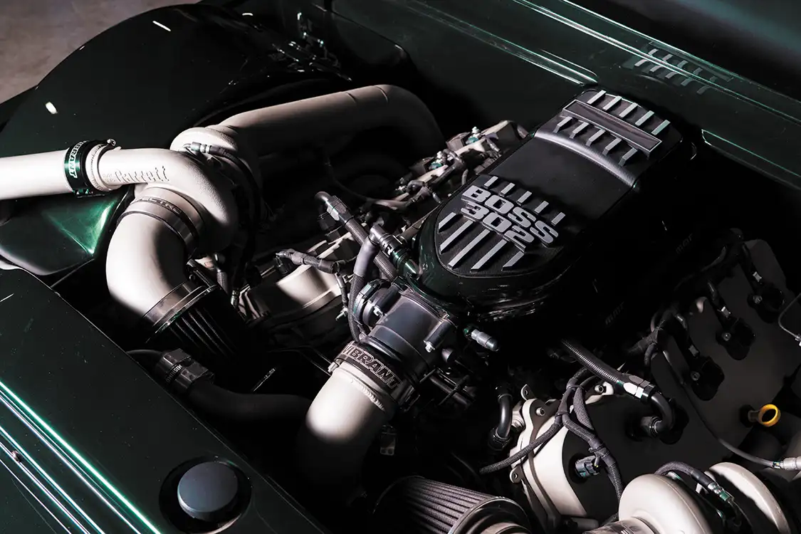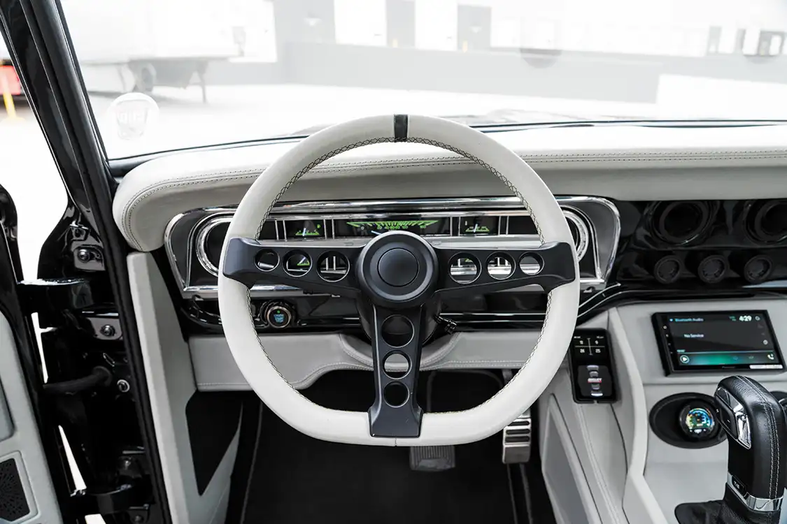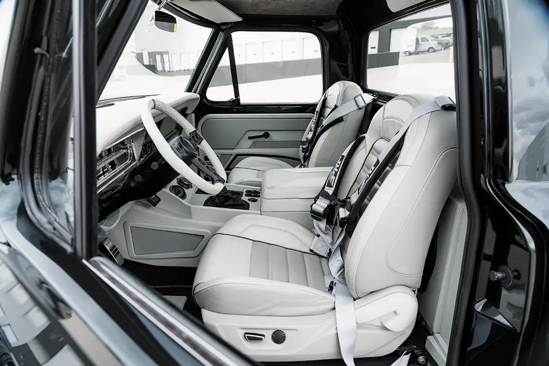 Speaking of performance, a 2017 Ford Gen 2 Coyote engine serves as the centerpiece of the Bullitt F-100’s horsepower production. Lending an assist are twin Garrett GTX35 turbos, as well as headers and an exhaust system that were fabricated in-house. All tubing within the engine bay was Cerakoted to lower thermal radiation and lend a hand in color coordination. An automatic 6R80 transmission allows for smooth sailing through the truck’s near-800 horsepower count, which has been carefully tuned to avoid the unruly tendencies of having that much muscle.