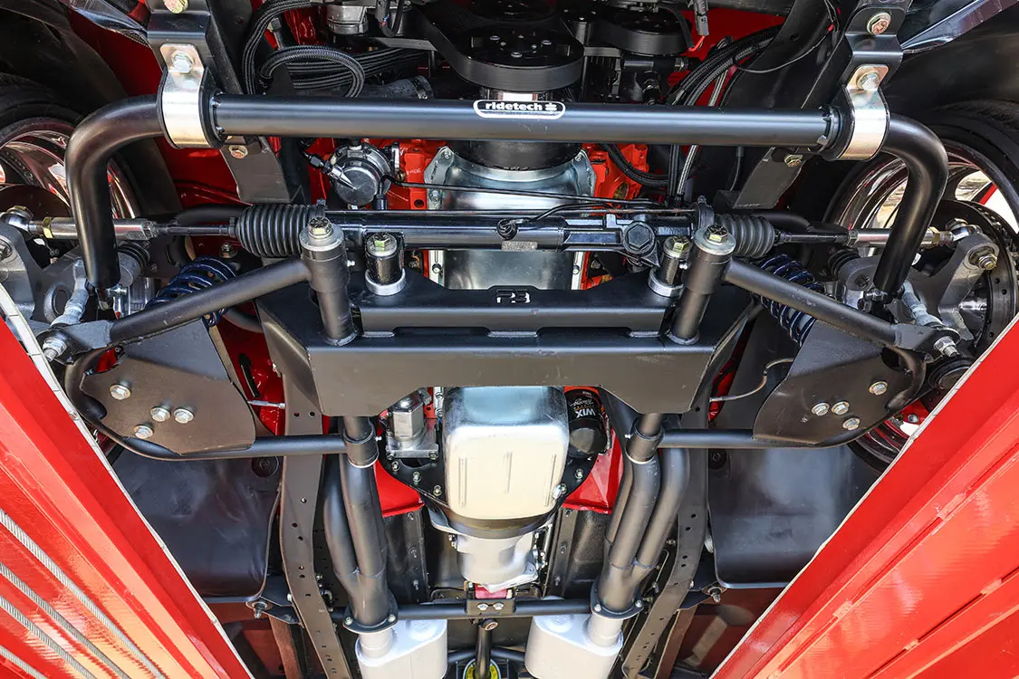 While the truck maintains its original frame rails, nothing else about the chassis is stock—starting with front and rear Porterbuilt Stage 3 crossmember kits that feature control arms in the front and truck arms at the rear. Adding to the truck’s ride quality are Hyperco front and rear springs, as well as Ridetech adjustable front and rear coilover shocks. Despite having no air suspension components, the truck rides noticeably low thanks to the Porterbuilt chassis components.