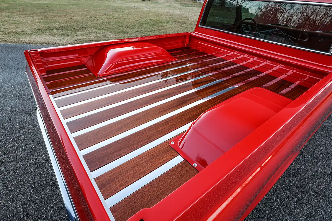 Look under the brilliant red paint and you’ll find body modifications like cut-out front wheelwells and rear wheeltubs from ChubTubz that have been narrowed by 4 inches. The truck also features a custom bed with a liftable center section, revealing added storage underneath. Beyond that, its beautiful polished chrome bumpers and trim pieces, along with custom halogen LMC Truck headlights, give the truck high-end lighting with an old-school look.