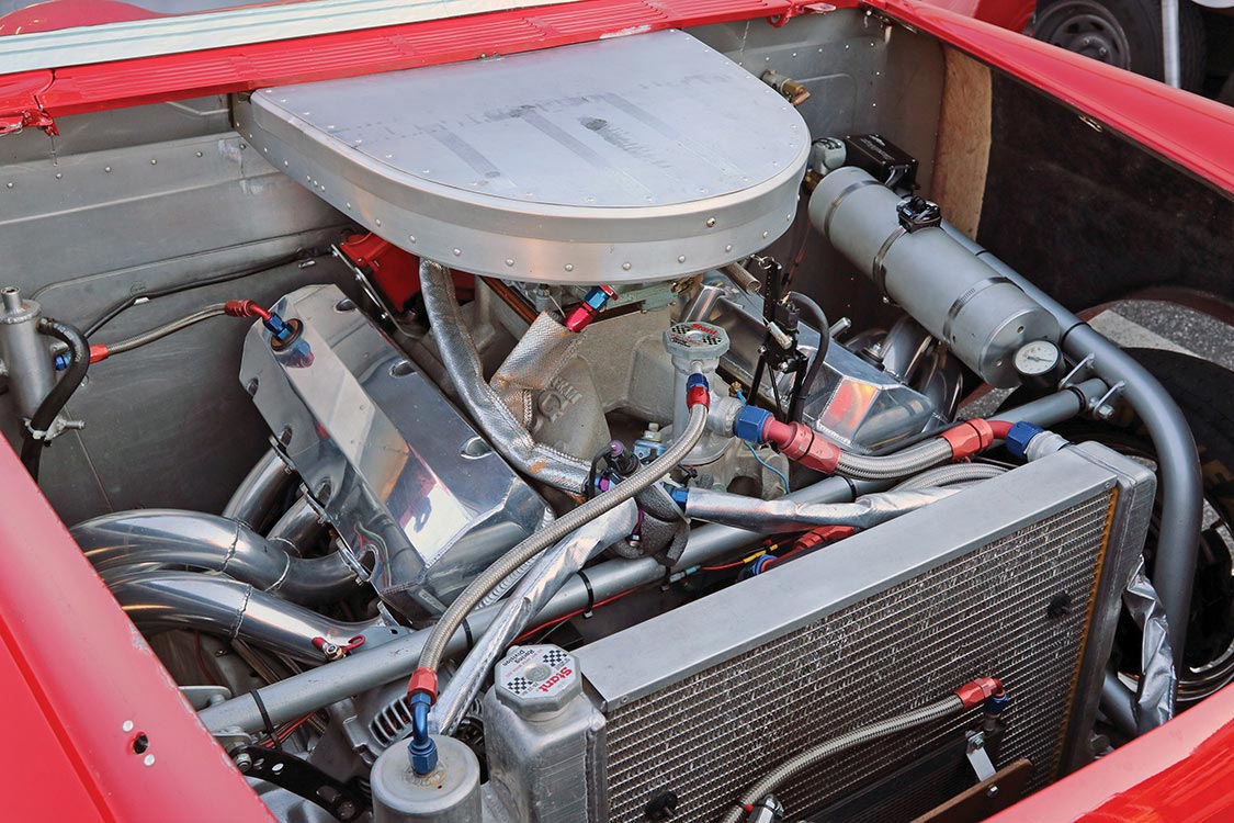 A Crane flat tappet 134771 cam with 1.7 ratio rocker arms orchestrates the valvetrain, while fuel delivery is handled by a single Holley 1,050- cfm carb fed by an Aeromotive electric pump. Matt’s father, Steve, fabricated both the custom cowlinduction- fed air cleaner and the stepped Jet-Hot-coated headers to finish the job. Behind the engine is a Powerglide with a Hughes 5800 stall converter and an ATI transbrake.