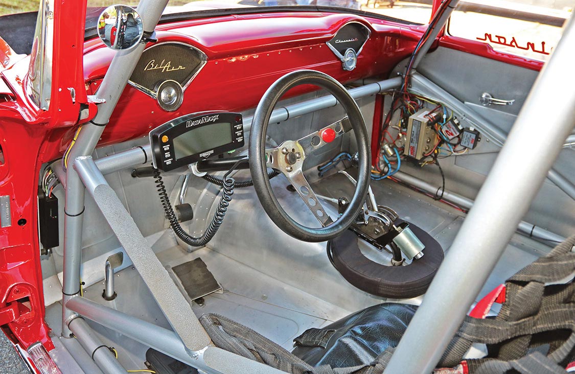 Steve had already replaced the stock frame with one from a 1957 Chevy station wagon, which was a one-piece extruded California unit that was lighter and stronger than the original 1955 version. The car uses the original upper A-arms, while Jim Meyer Racing Products provided the lower tubular control arms along with a rack-and-pinion kit. Modified six-cylinder Nova springs, double-adjustable QA1 shocks and Wilwood disc brakes with 10-inch rotors were added to complete the front end.