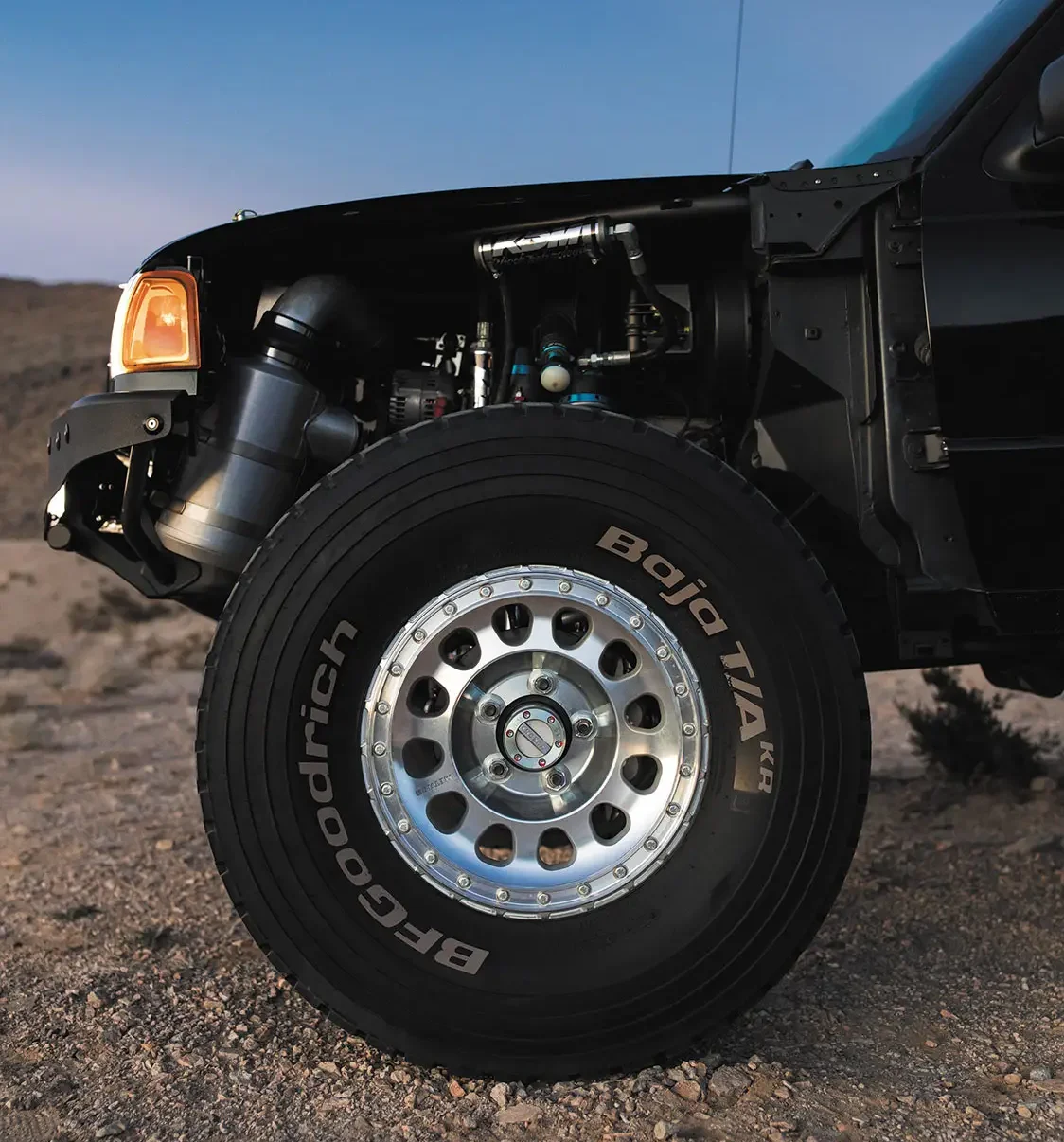 17×9 Method Race Wheels 103 beadlock wheels, 37-inch BFG Baja T/A Project tires, Wilwood braking components, BTF custom remote mount reservoir