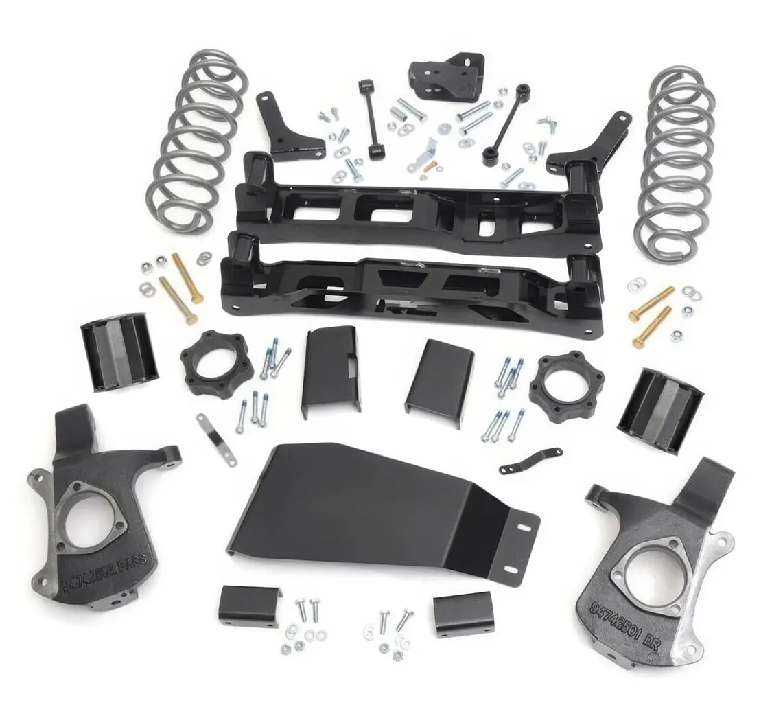 10. You can see the parts included in this 5-inch lift kit from Rough Country. We just need to install the crossmember for the new controller mount locations and new spindles and springs for the front.11. Andrew and Brenden both installed the front crossmembers, which will give us a new lower mounting location for the lower control arms