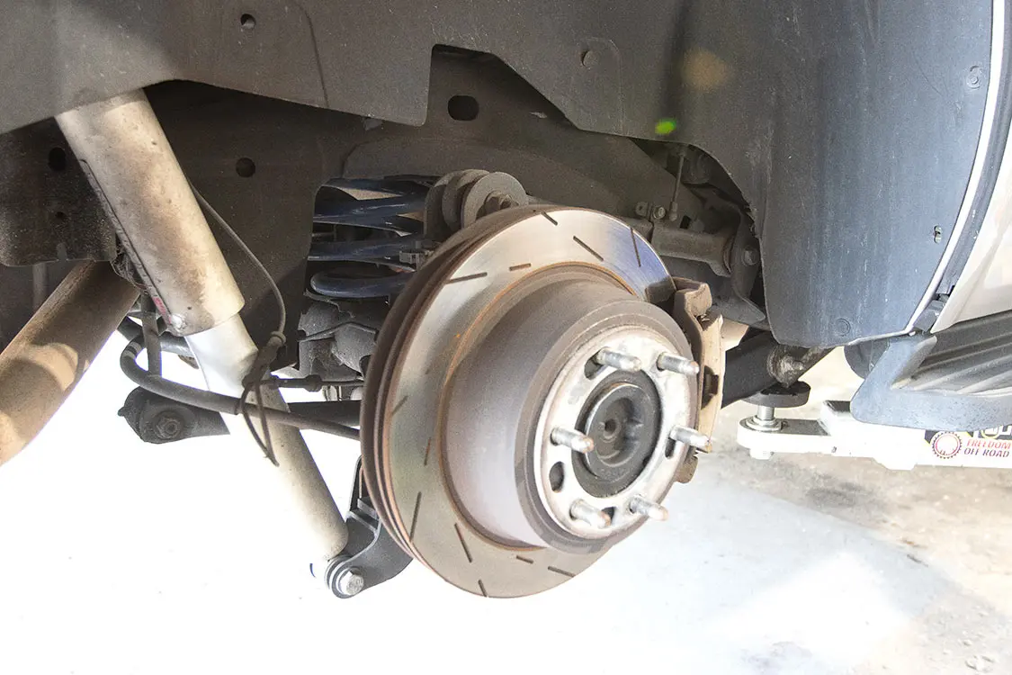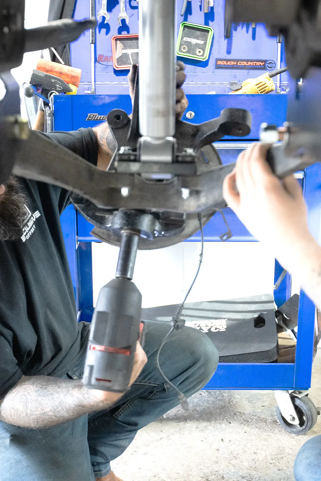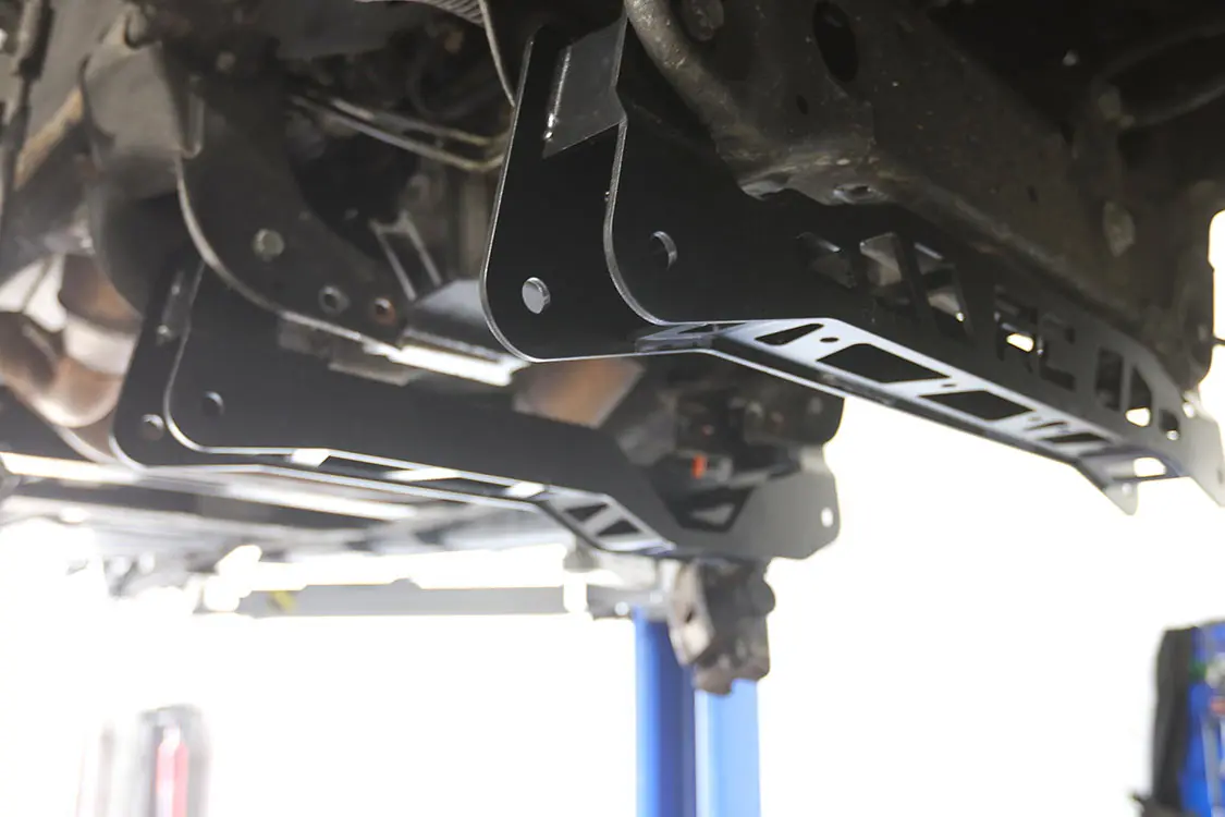 12. With the new crossmembers installed, you can see how the control arm mounting points are lower, which will raise the truck stance.13. Now all the guys at Exclusive Offset can reinstall the original lower control arms.14. In order to install the new spindles, Andrew removed the hub from the original spindle and followed the instructions from Rough Country to trim away a small piece of the brake dust shield for clearance.