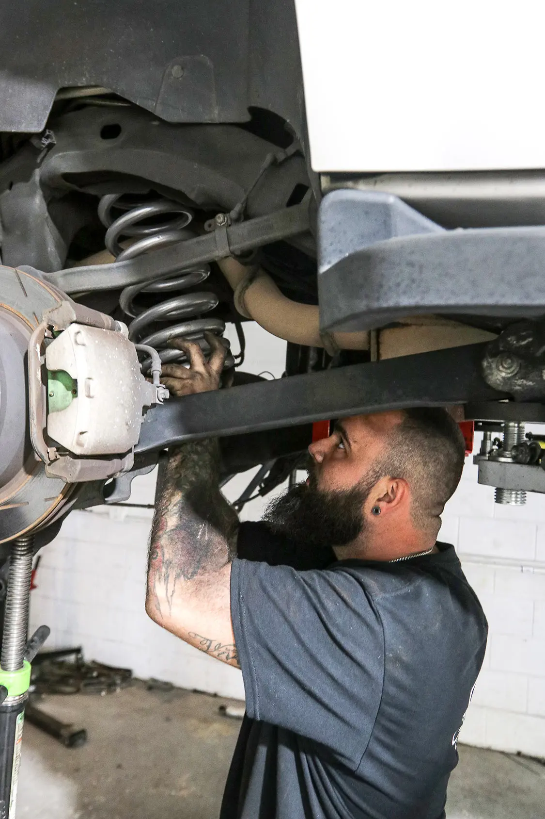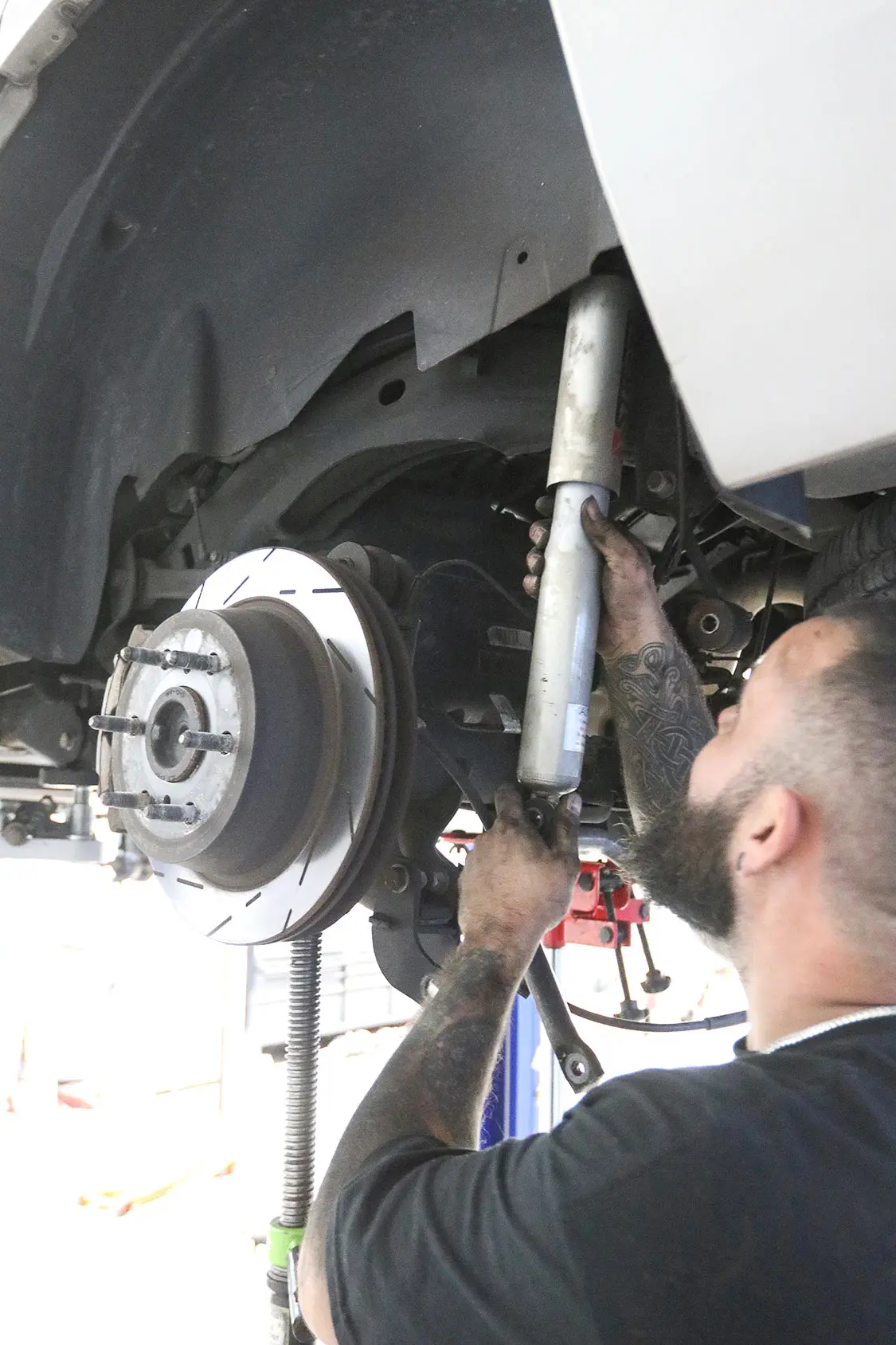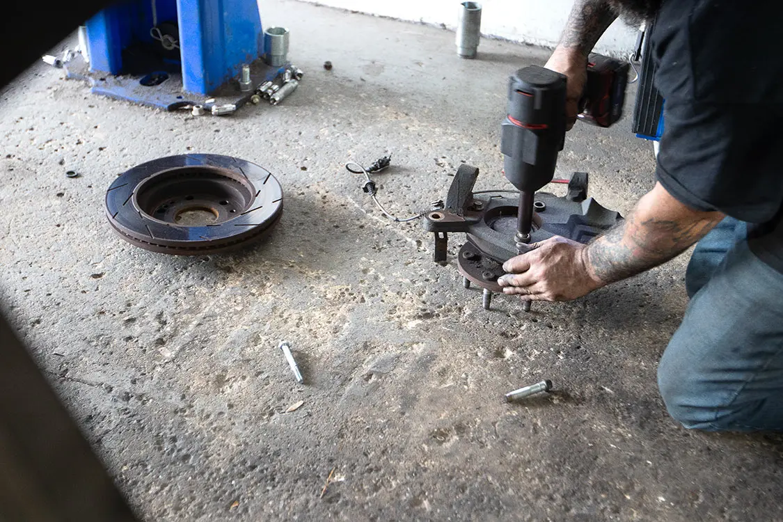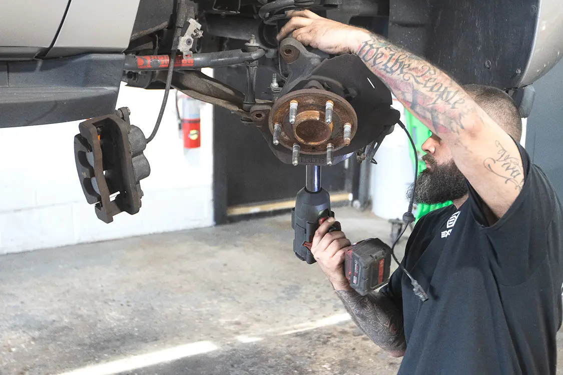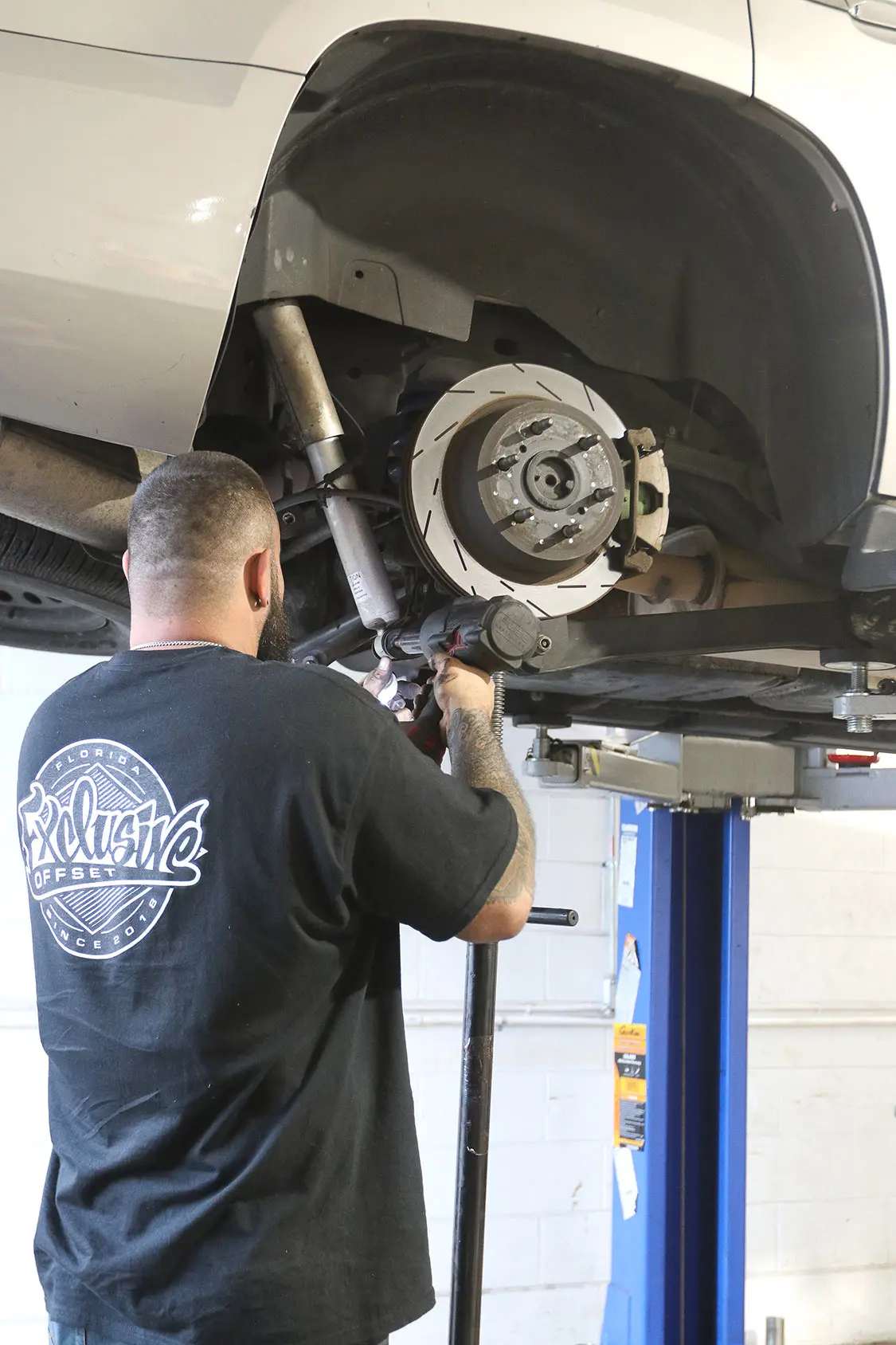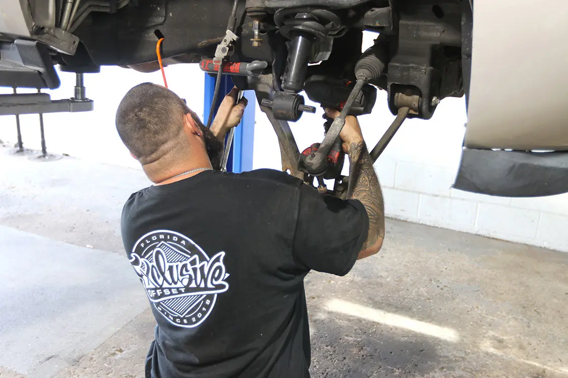 01. Exclusive Offset in Ocala, Florida, is our go-to shop for anything lifted or off-road related. The crew there has been building some of the best trucks on the East Coast for many years, and Brenden is a highly detailed installer whom we fully trust.02. The combination of this Rough Country 5-inch lift along with 24-inch Fittipaldi wheels and Atturo tires will give our 2008 Chevy Tahoe an all-new look and feel.03. It’s obvious how much taller this truck will need to be to clear these new Atturo tires.04. With any major project, it’s always best to have a buddy with a lift because doing this on the ground would not only take quite a bit more time, but also be extremely frustrating all around.05. Andrew is the No. 1 tech over at Exclusive Offset other than Brenden himself, so we were excited when he was the one who was assigned to our truck modification.06. This lowered suspension will have to be completely replaced, including the shocks, springs, and drop shock extenders.07. Starting on the front, Andrew disconnected the front sway bar and removed the brake caliper and rotor.08. Now he can start to remove the front spindle and hub to replace it with the new parts.