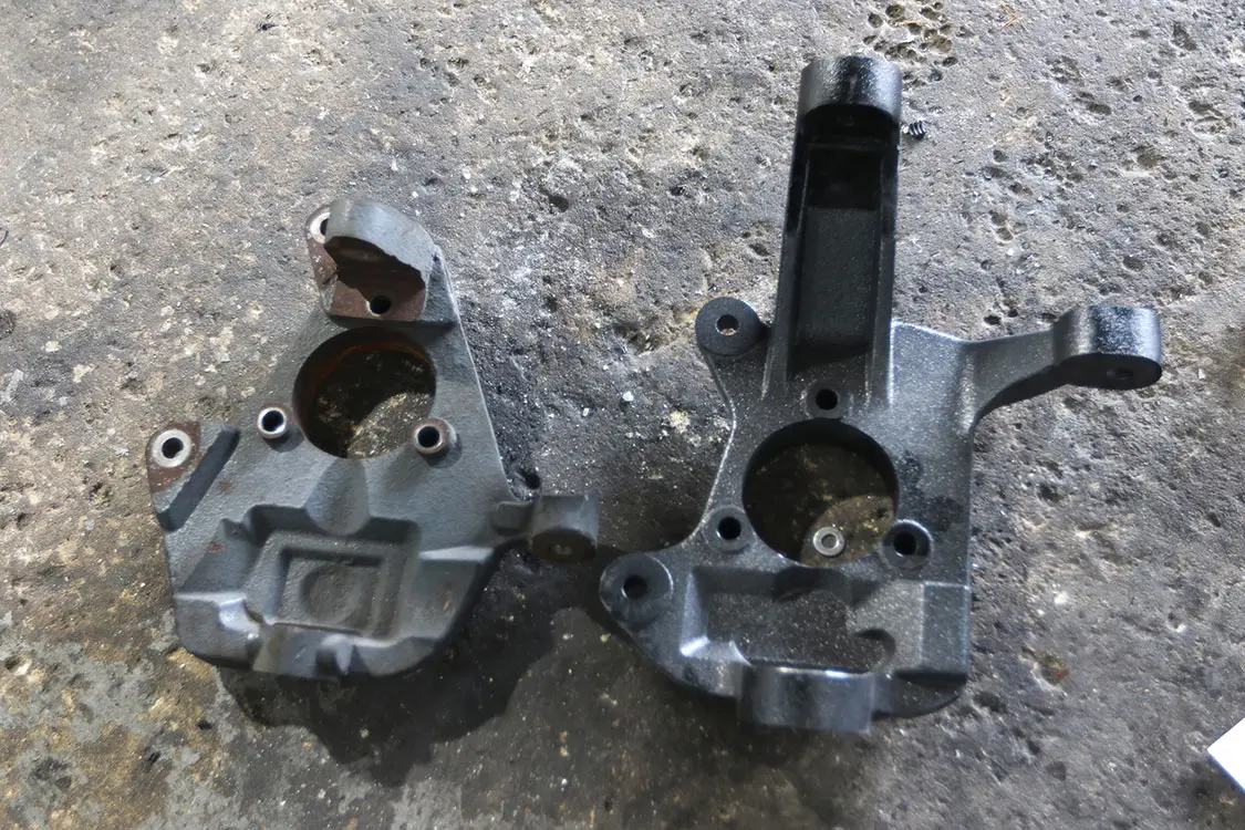 15. You can see the dramatic difference between a lowered spindle and a 5-inch lift spindle for a 2008 Chevy Tahoe. The original hub was soon reinstalled on our new spindle to get it back on the truck.