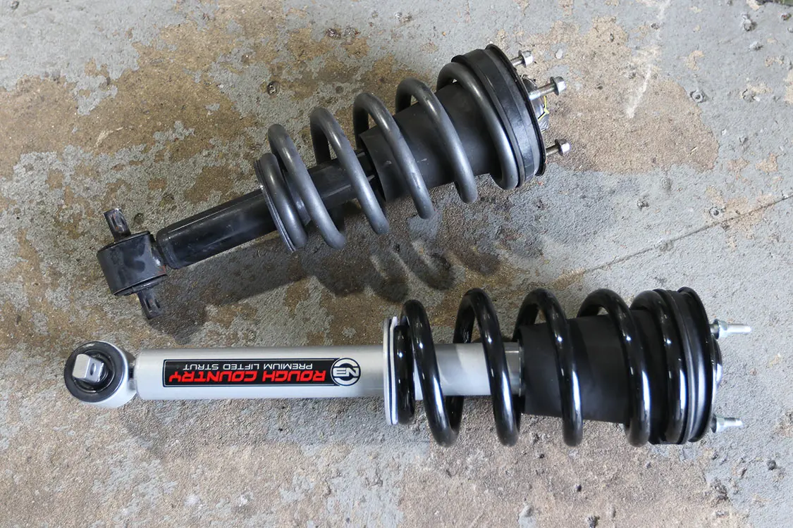 When shopping for a new suspension, we knew we needed something that came with a new front spindle since we replaced the original ones with drop spindles, as well as new springs for the front and rear of this truck. The new 5-inch lift suspension from Rough Country features a set of beefy lifted knuckles, ¼-inch-thick steel front and rear high-clearance crossmembers, and plenty of muscle to handle hazards both on and off-road. This kit utilizes 100% precision laser-cut materials and the latest in computer-aided-design process. It requires no strut disassembly or strut compressor for installation, as well as no modification to the stock differential mounts, drivetrain, or exhaust.