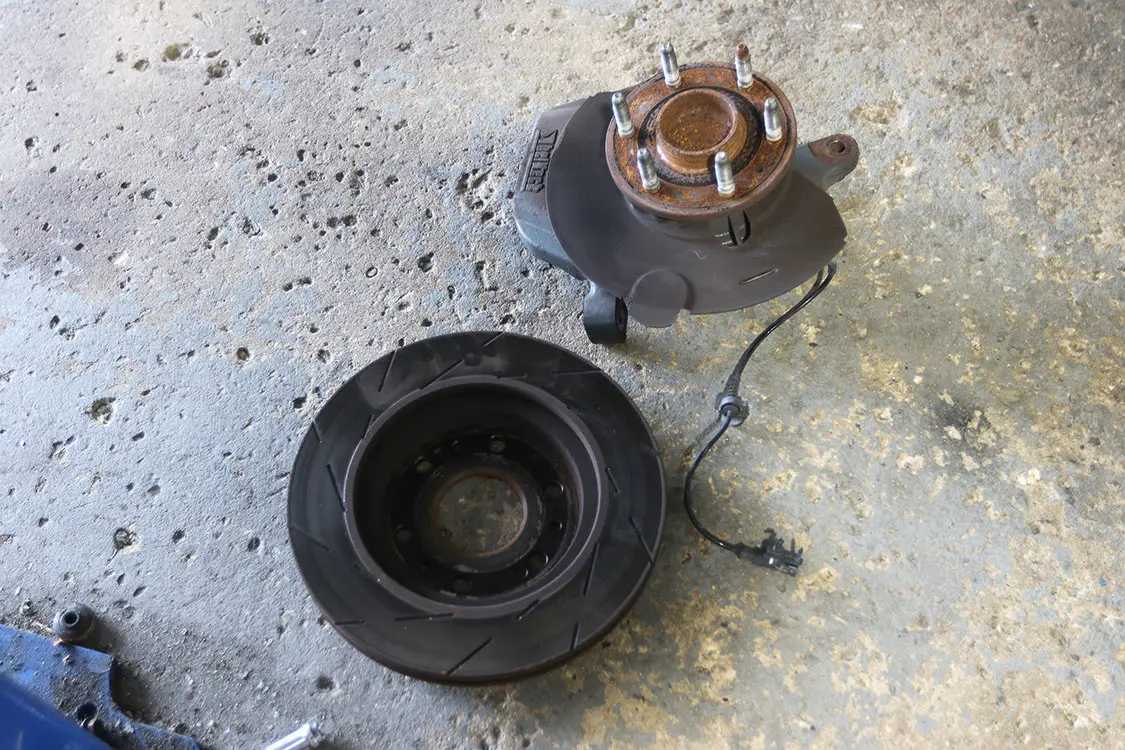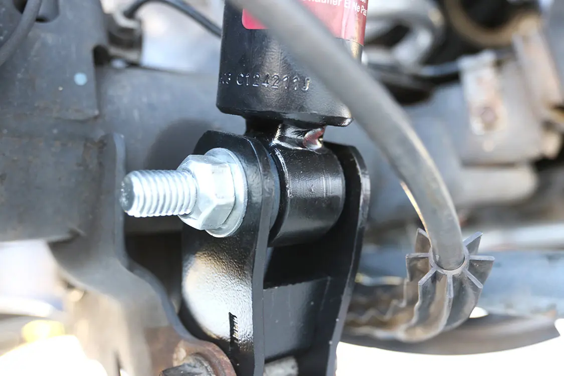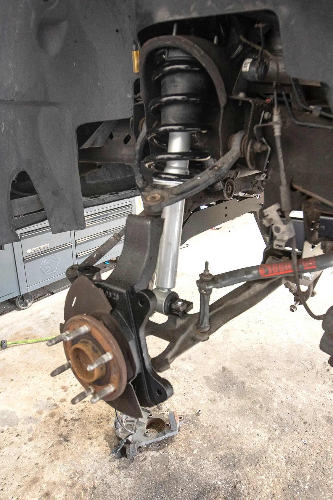 16. With the control arm reinstalled, it was time to turn the attention to the front shocks, which come fully assembled from Rough Country.17. You can see the dramatic difference between a lowered spindle and a 5-inch lift spindle for a 2008 Chevy Tahoe. The original hub was soon reinstalled on our new spindle to get it back on the truck.18. With the shocks installed, Andrew then installed the front spindle with the brake hub already attached.19. After tightening all the bolts and reattaching the steering linkage and sway bar, you can see how the frontend goes back together.