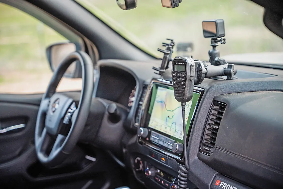 On the dash is a RAM Mounts Quick Grip Phone Holder, as well as a GoPro Mount and Mic Mount. Midland Radios handle all of Smith’s comms through an MXT275 Micromobile Two-Way Radio, MXTA 25 Ghost Antenna, MXTA 22 ditch light bracket mount, and MXTA 24 Antenna. An AGM Battery with a SwitchPros SP9100 keep all of his tech powered and controlled.