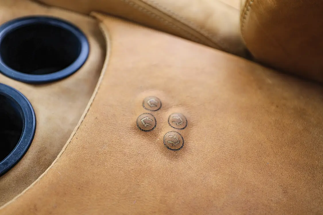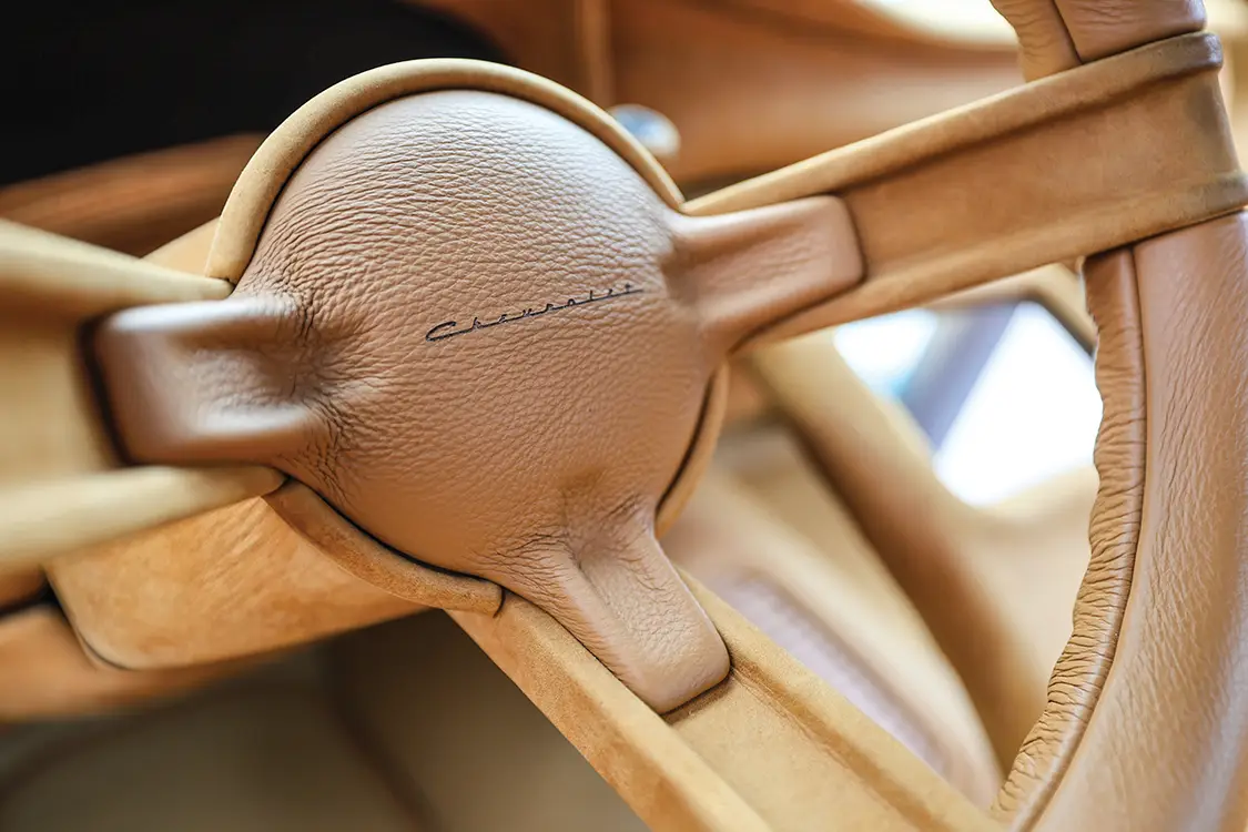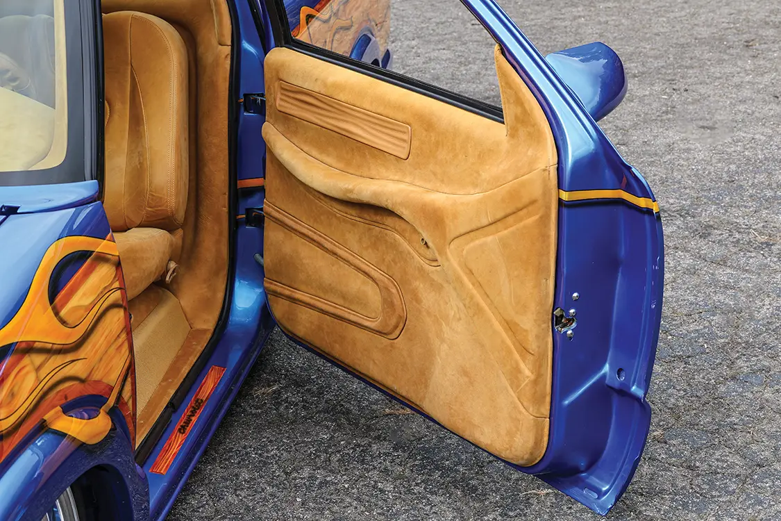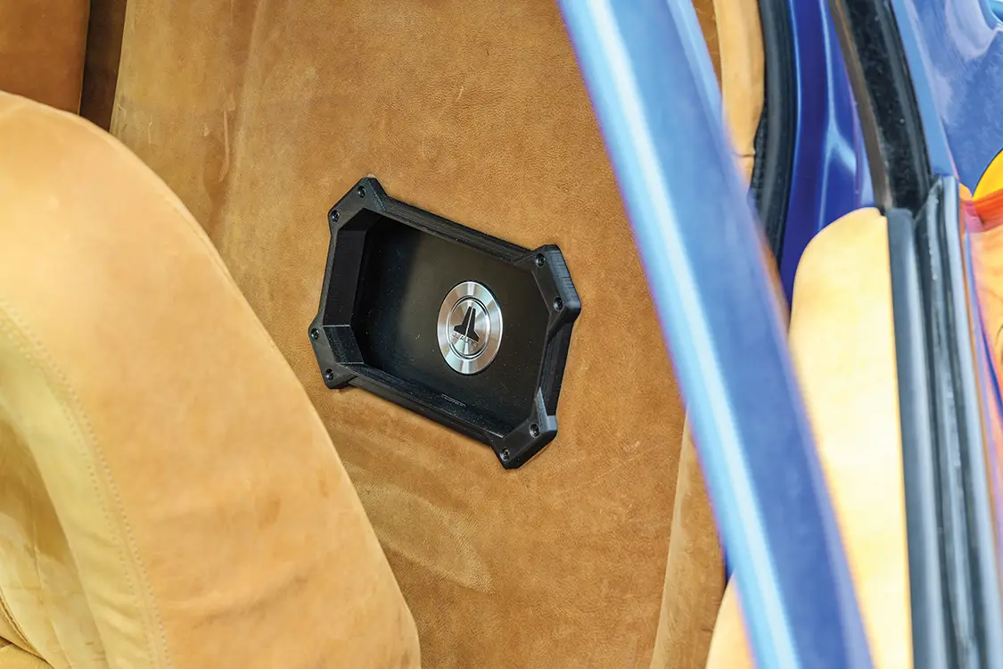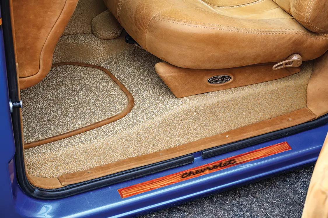 Delays hit hard with shop moves and life interruptions that pushed the body completion to 2007. Josh hauled FYRWOOD home for wedding photos, then dove into the engine work in his garage. Upgrades like a March pulley system, AC Delco injectors, a fuel pump, and a second painted tank followed, but a bigger space was needed. Fast-forward to 2020: Trent VanArsdalen at Trent’s Trick Upholstery got free rein on the interior. Over six hides of Indian River leather from Apex Auto were used to cover everything. Trent created custom buckets from the stock bench with hand-carved foam and then made a floating center console with a new audio system that consists of a Pioneer DMH-WC6600NEX head unit, JL Audio amps, speakers, and sub. The interior also features a shaved aluminum floor, laser-etched buttons, a custom steering wheel with 3D-printed accents, and even handmade pedals and mats. Trent’s artistry turned it badass, hidden from Josh until the big reveal.