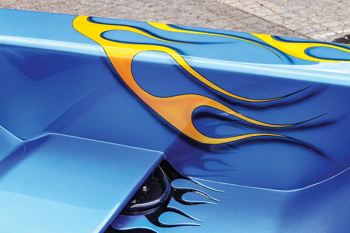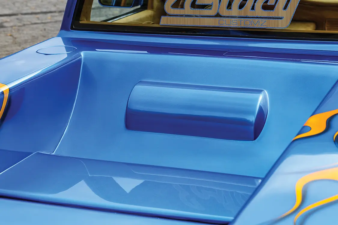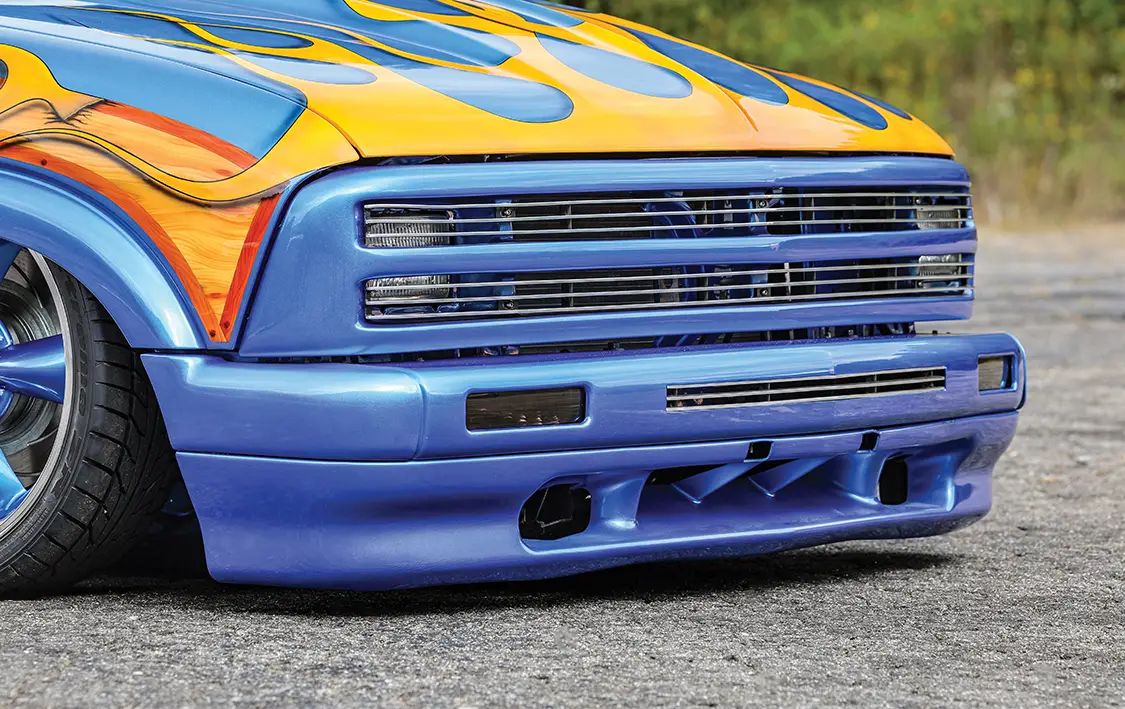 Then came the fateful Friday in 2001. With his trailer loaded for a show, Josh forgot to loosen the rear straps on the leaky air ride. Two miles down the road, a car cut him off, forcing a hard brake. Boom! The truck shifted, smashing plastic chairs into the front bumper. What could’ve been a total loss was contained by the front straps—lucky break! Most folks would’ve patched the scratches and moved on, but Josh saw opportunity. He called Carey at Bewley’s Body Works in Indy, and what started as bumper fixes ballooned into a full teardown: suicide doors with chrome hinges, a body drop, and shaved handles, with lights, tailgate, and antenna all gone. A custom one-off grille and bumper were built by Josh and crew, as was a relocated gas door, flames cut into the bed floor, and a fully tubbed rear for those big wheels to breathe. House of Kolor blue paint by Mike Minchoffer and the team brought it to life, with suspension tweaks from Air Lift, Firestone, RideTech, and SSBC making things more interesting.