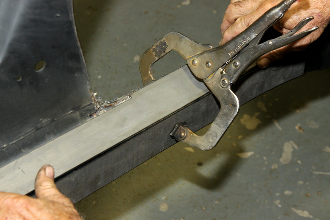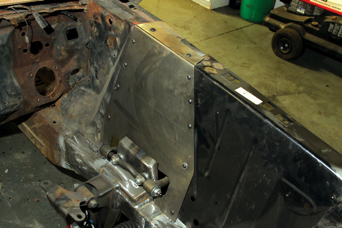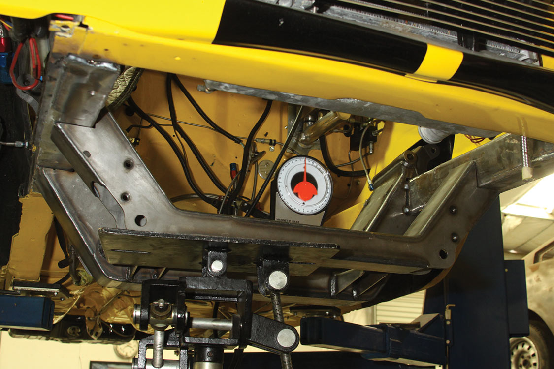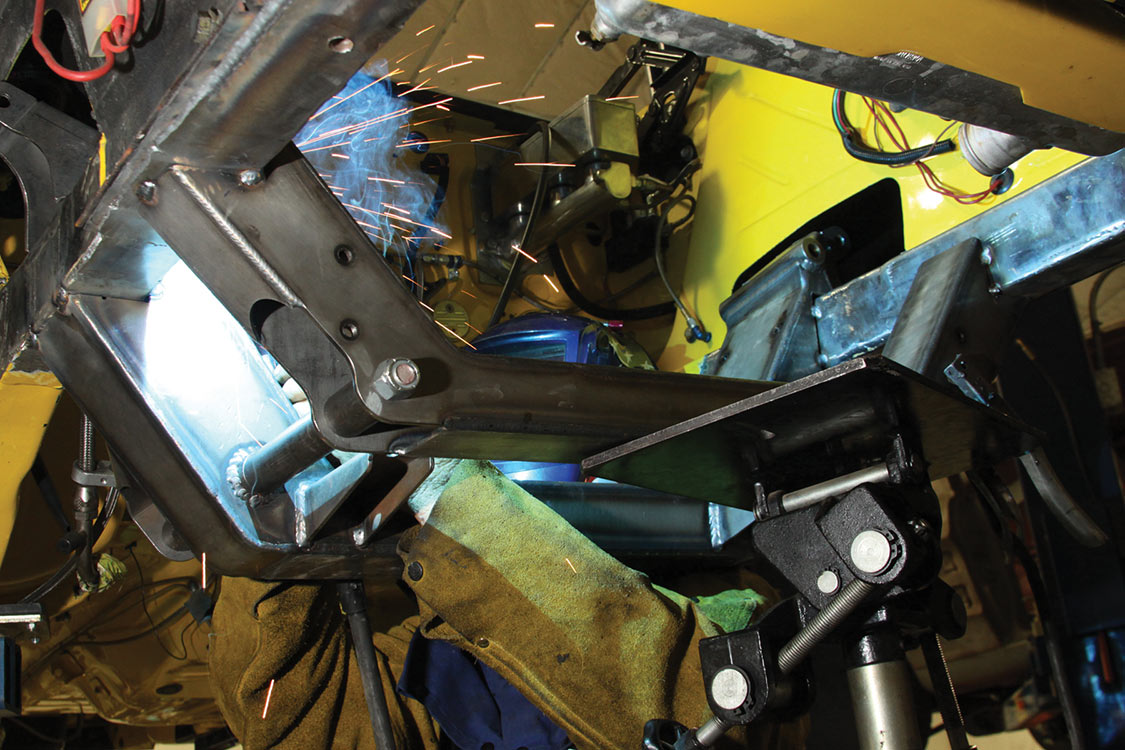 1. These components are the working bones of the Heidt’s system for 1965-70 Mustangs. Of course, there’s a frame-rail-to-frame-rail weld-on subframe that gives a vintage Mustang platform solid integrity like never before. What you see here are tubular upper and lower control arms, spindles and adjustable coil-over shocks. These pieces can be painted or powder-coated depending upon your budget. Stang-Aholics says it has teamed with Heidt’s to bring classic Ford compact enthusiasts a front suspension system that gives these old Fords real sports car handling. Upper control arms have fully adjustable Heim joints, which enable easy front-end alignment and tuning. Coil-over shocks offer ride and handling adjustments that take the guesswork out of suspension tuning. The optional adjustable sway bar (not included in base PRO G kit) controls body roll, keeping your Mustang intimate with the road in the toughest of turns.2.These components are the working bones of the Heidt’s system for 1965-70 Mustangs. Of course, there’s a frame-rail-to-frame-rail weld-on subframe that gives a vintage Mustang platform solid integrity like never before. What you see here are tubular upper and lower control arms, spindles and adjustable coil-over shocks. These pieces can be painted or powder-coated depending upon your budget. Stang-Aholics says it has teamed with Heidt’s to bring classic Ford compact enthusiasts a front suspension system that gives these old Fords real sports car handling. Upper control arms have fully adjustable Heim joints, which enable easy front-end alignment and tuning. Coil-over shocks offer ride and handling adjustments that take the guesswork out of suspension tuning. The optional adjustable sway bar (not included in base PRO G kit) controls body roll, keeping your Mustang intimate with the road in the toughest of turns.3.PRO G installation begins with frame rail reinforcements. These are marked reinforcement plates that are clamped in a square and carefully measured per Heidt’s instructions and welded in place. These plates yield a solid frame rail that the Heidt’s subrame members can be welded to. Make no mistake, the Heidt’s PRO G front suspension system is major surgery, requiring complete removal of your Mustang’s shock towers and strut rod supports. Once these structural members are removed, installation begins with the plates, which make the Mustang’s sheet metal frame rails more like a subframe.4.With the reinforcement plates welded in place and ground smooth, Ron Peter of Stang-Aholics begins mock-up work with the Heidt’s PRO G front subframe. The PRO G subframe is a permanent weld-on piece that becomes an integral part of the body structure. The key to success is to establish datum marks once you’ve confirmed your Mustang’s unibody is perfectly square and true. A twisted and damaged body is not the place to install the PRO G subframe. If the body is out of factory specifications, it must be straightened by a professional with a frame table or another body must be found. The Heidt’s instructions are very specific and detailed, which allows you to correctly position and mock-up the subframe before clamping and welding.5.The base PRO G subframe is correctly positioned prior to welding. Before any of this can be done, the body must be seated on a perfectly level surface. The PRO G weld-on subframe has been mocked up and is secured at the frame rails. It’s perfectly plumb and ready for welding. Notice that Ron has already spot-welded a couple of locations, but he won’t lay down a solid bead until everything is positioned and verified. Keep in mind that when you weld, heat distorts the metal and dimensions change. This is why you pinpoint spot weld first and allow steel to cool.