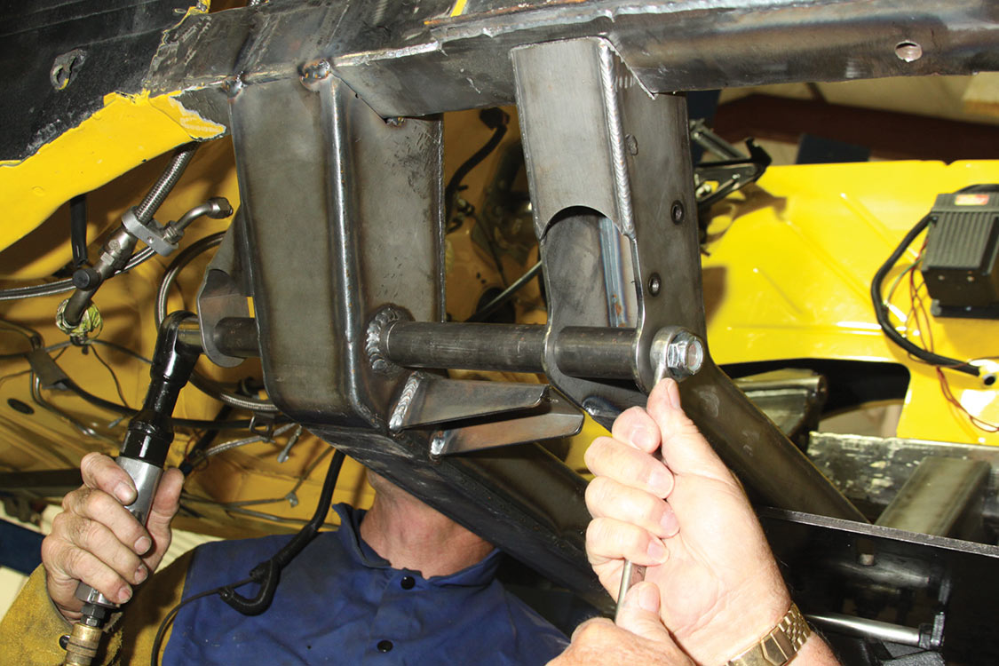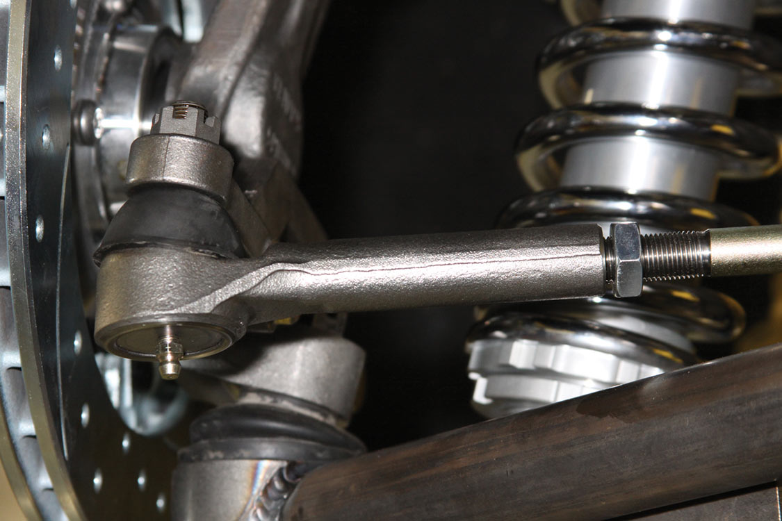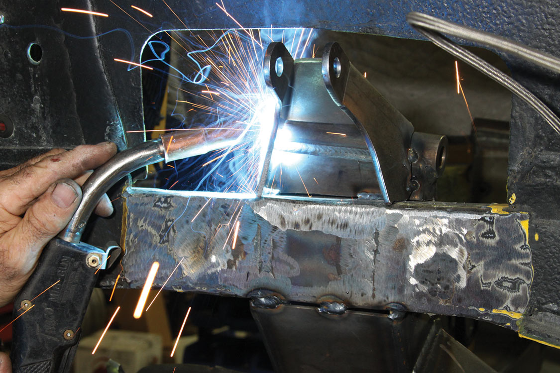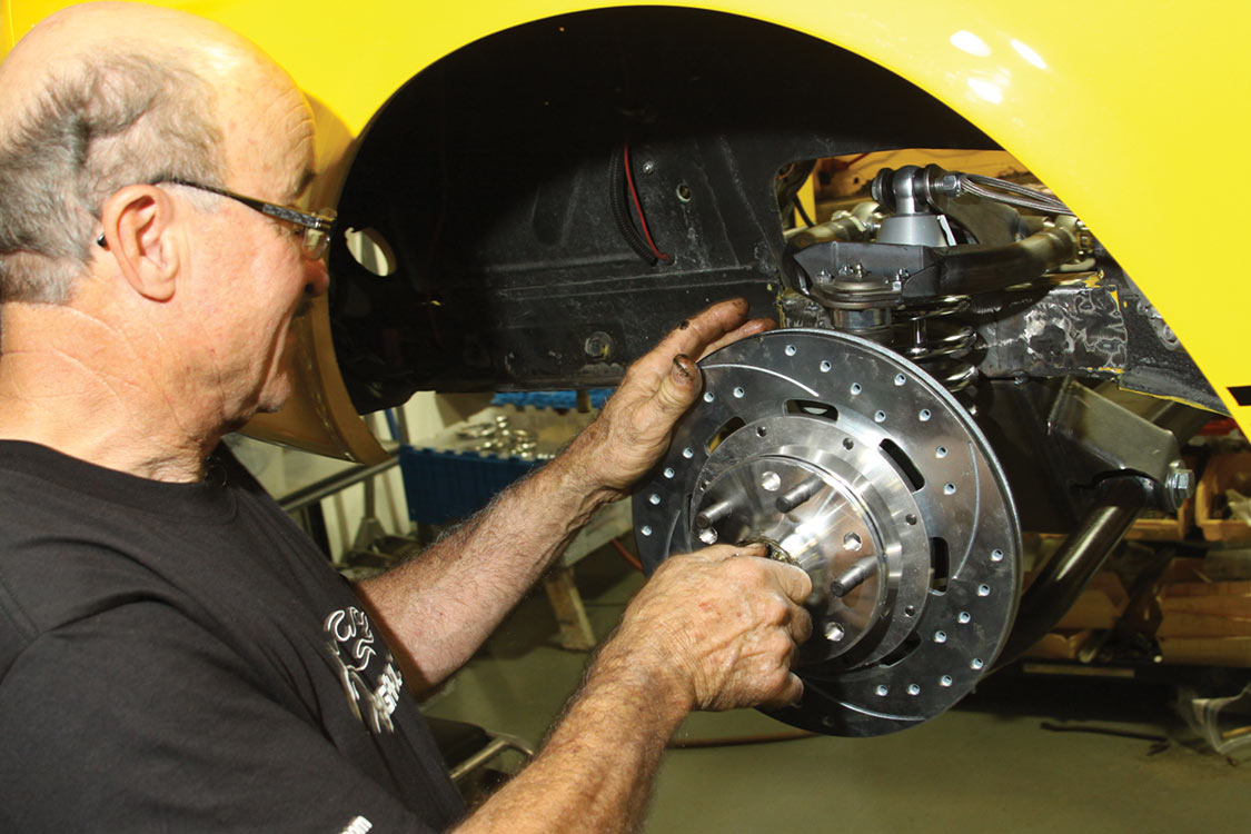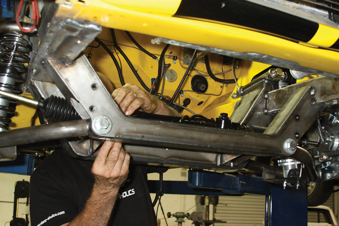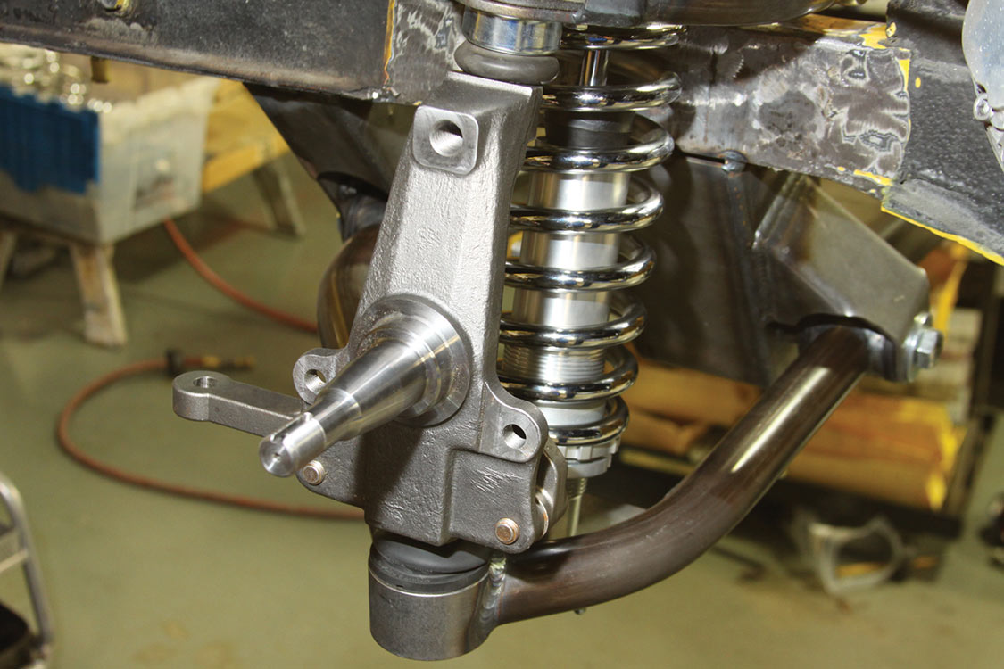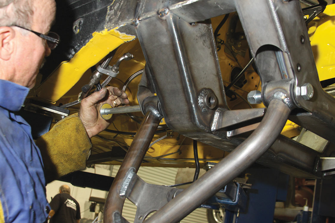 6.Subframe mock-up has been accomplished, allowing Ron to weld a solid bead along all seams. The thing is, you don’t want the steel to distort, which calls for welding 1-2 inches at a time and allowing everything to cool before continuing. Here, the main subframe is welded in segments and allowed to cool. Everything is plumb and true which means component installation will be straightforward.7.The upper shock mount is positioned and secured for welding. It’s a good idea to perform a mock-up here prior to welding. Temporarily install the coil-over shock and lower control arm and position the mount. Then, weld the mount in 1-2-inch beads and allow to cool.8.The upper shock mount is positioned and secured for welding. It’s a good idea to perform a mock-up here prior to welding. Temporarily install the coil-over shock and lower control arm and position the mount. Then, weld the mount in 1-2-inch beads and allow to cool.9.The secondary subframe is positioned and bolted to the main subframe as shown. Contact surfaces are perfectly mated and dimensions checked per the Heidt’s instruction sheet, then bolts are tightened. This gets the front subframe package square and true with the Mustang’s frame rails. Again, check your dimensions before finishing welding.10.The secondary subframe is positioned and bolted to the main subframe as shown. Contact surfaces are perfectly mated and dimensions checked per the Heidt’s instruction sheet, then bolts are tightened. This gets the front subframe package square and true with the Mustang’s frame rails. Again, check your dimensions before finishing welding.11. The secondary subframe is positioned and bolted to the main subframe as shown. Contact surfaces are perfectly mated and dimensions checked per the Heidt’s instruction sheet, then bolts are tightened. This gets the front subframe package square and true with the Mustang’s frame rails. Again, check your dimensions before finishing welding.12.Heidt’s PRO G lower control arms are coated with the urethane lube provided, and bolts are installed and snugged. Do not tighten these bolts until all suspension components have been installed because you want everything in its place before you begin tightening fasteners. Always double and triple check fasteners for tightness and secure with cotter pins before putting the vehicle back on the ground. This is not an issue to take lightly because you don’t want to be caught without steering and suspension.13.Heidt’s PRO G lower control arms are coated with the urethane lube provided, and bolts are installed and snugged. Do not tighten these bolts until all suspension components have been installed because you want everything in its place before you begin tightening fasteners. Always double and triple check fasteners for tightness and secure with cotter pins before putting the vehicle back on the ground. This is not an issue to take lightly because you don’t want to be caught without steering and suspension.14.The PRO G coil-over shocks are installed next. Heidt’s adjustable coil-overs are available in plain or polished, with chromed coil springs. Ride height is adjustable via spring adjustment, and ride quality and dampening are adjustable through two valves and 10-position adjustments so you can fine-tune suspension function. These shocks are 12 ¾ inches extended and 9 ½ inches compressed. They’re easy to install and service.15.Upper control arms employ beveled spacers that go between the Heim joints and subframe. These long bolts serve as the pivot point for upper control arms. What makes PRO G an awesome setup is the fully articulating Heim joints that allow firmness and flexibility at the same time in the PRO G’s upper control arms. Heim joints also allow a full range of camber and caster adjustment.16. Upper control arms employ beveled spacers that go between the Heim joints and subframe. These long bolts serve as the pivot point for upper control arms. What makes PRO G an awesome setup is the fully articulating Heim joints that allow firmness and flexibility at the same time in the PRO G’s upper control arms. Heim joints also allow a full range of camber and caster adjustment.17. PRO G upper and lower control arms as installed on the Stang-Aholics Mustang fastback resto-mod. As you can see, lower arms are fixed position with rock solid urethane bushings that will maintain position with great consistency. Upper arms sporting Heim joints are not only adjustable and fully articulating, they will maintain alignment settings because it’s virtually impossible to knock them out of adjustment.18.Heidt’s 2-inch dropped spindles are set up for the PRO G’s Wilwood disc brakes. This gets your Mustang more intimate with the pavement in road-hugging coolness because down low is where it’s at if you want real handling and good looks. With the Heidt’s lower ride height comes a more useful center of gravity detrimental only to ant mounds because we’re talking low down.19.Ron preps and installs our optional race-bred Wilwood disc brakes, which have conventional spindles and wheel bearings. Bearings have been washed in a petroleum-based solvent and packed with high-temperature wheel bearing grease. Ron ascertains proper seating of inner and outer bearings and lubricates the axle seal. Surfaces between bearings and spindle must be dry for bearing security. The bearing’s inner race should be secure at the axle spindle; it shouldn’t turn. Wilwood disc brakes are easy to service; pad replacement involves this cotter pin, which makes it easy to remove worn pads and install new in a matter of minutes.20.Ron preps and installs our optional race-bred Wilwood disc brakes, which have conventional spindles and wheel bearings. Bearings have been washed in a petroleum-based solvent and packed with high-temperature wheel bearing grease. Ron ascertains proper seating of inner and outer bearings and lubricates the axle seal. Surfaces between bearin