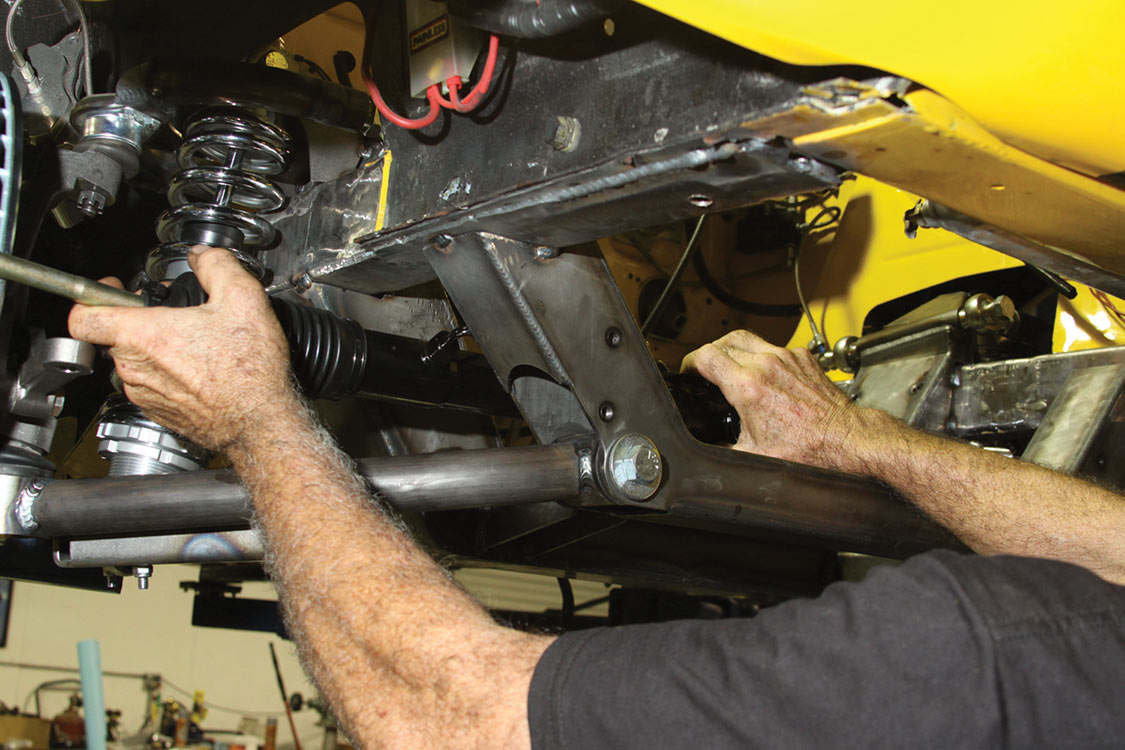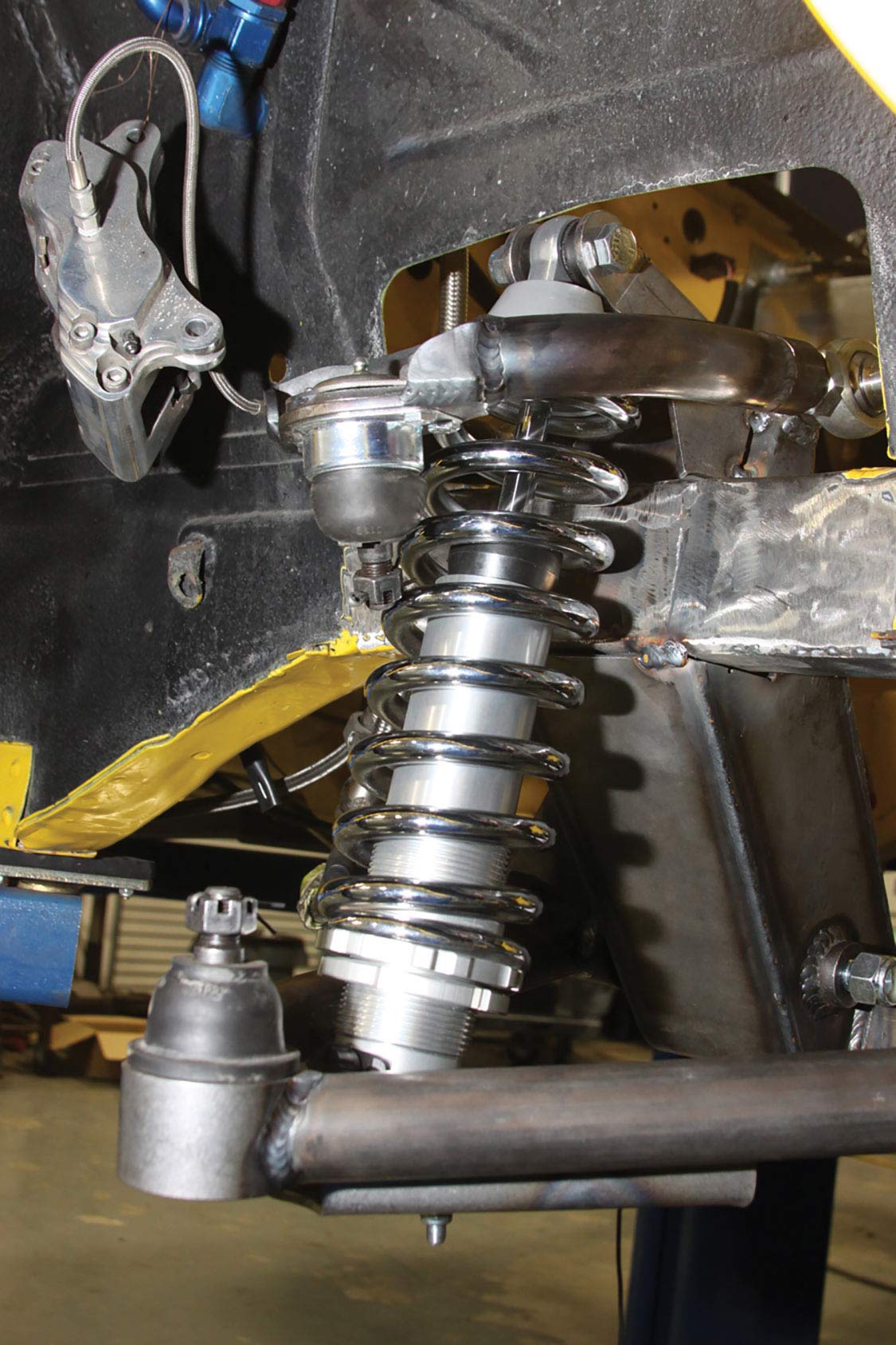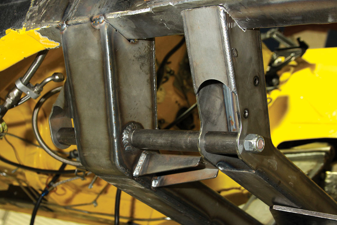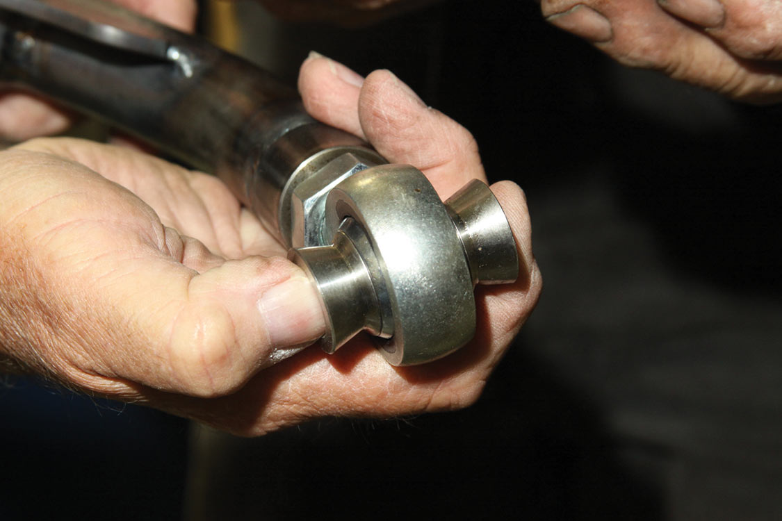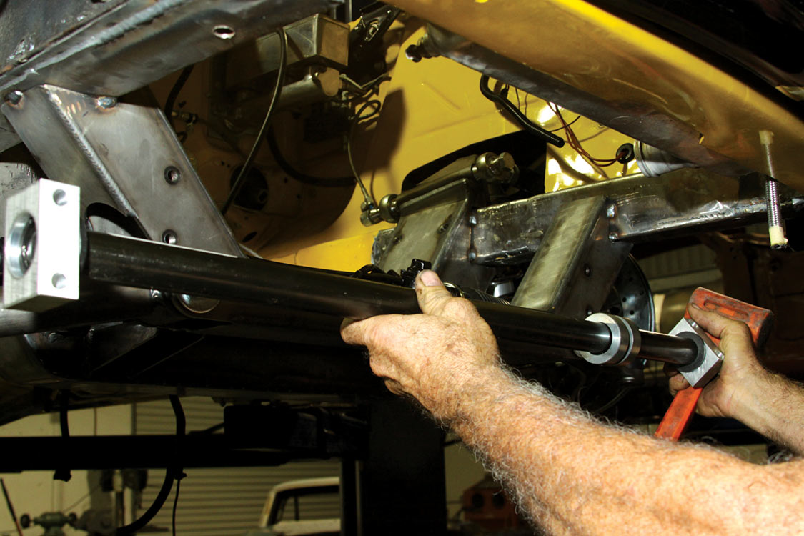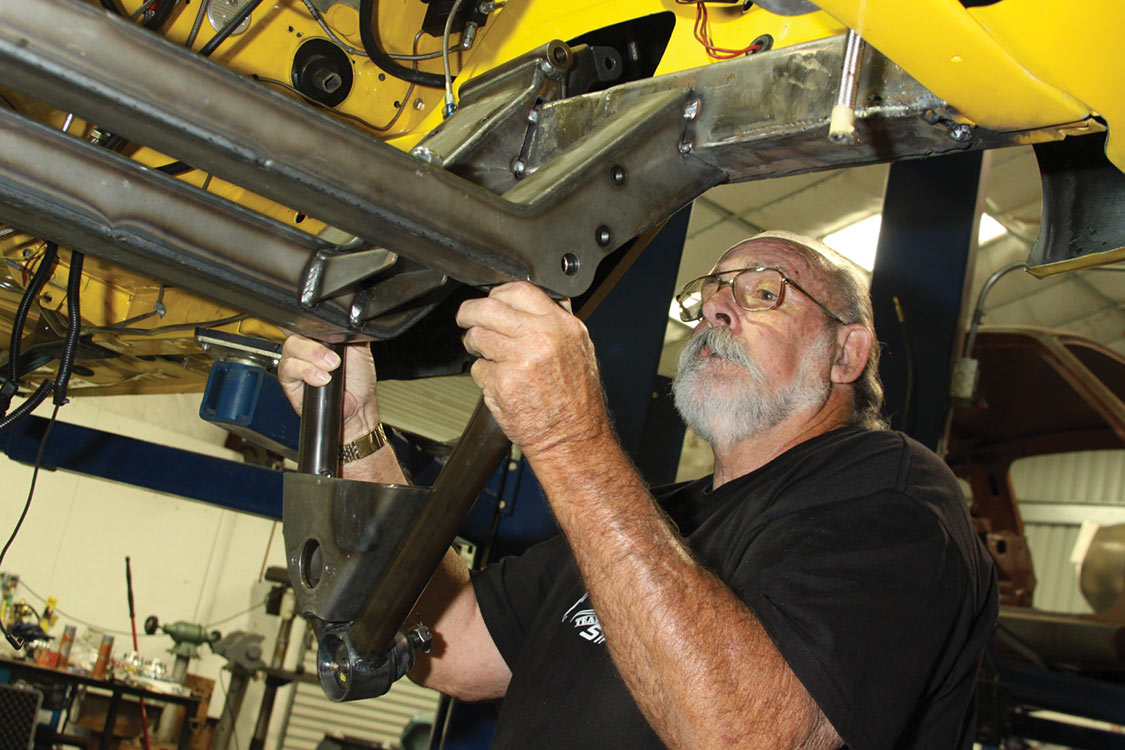 6.Subframe mock-up has been accomplished, allowing Ron to weld a solid bead along all seams. The thing is, you don’t want the steel to distort, which calls for welding 1-2 inches at a time and allowing everything to cool before continuing. Here, the main subframe is welded in segments and allowed to cool. Everything is plumb and true which means component installation will be straightforward.7.The upper shock mount is positioned and secured for welding. It’s a good idea to perform a mock-up here prior to welding. Temporarily install the coil-over shock and lower control arm and position the mount. Then, weld the mount in 1-2-inch beads and allow to cool.8.The upper shock mount is positioned and secured for welding. It’s a good idea to perform a mock-up here prior to welding. Temporarily install the coil-over shock and lower control arm and position the mount. Then, weld the mount in 1-2-inch beads and allow to cool.9.The secondary subframe is positioned and bolted to the main subframe as shown. Contact surfaces are perfectly mated and dimensions checked per the Heidt’s instruction sheet, then bolts are tightened. This gets the front subframe package square and true with the Mustang’s frame rails. Again, check your dimensions before finishing welding.10.The secondary subframe is positioned and bolted to the main subframe as shown. Contact surfaces are perfectly mated and dimensions checked per the Heidt’s instruction sheet, then bolts are tightened. This gets the front subframe package square and true with the Mustang’s frame rails. Again, check your dimensions before finishing welding.11. The secondary subframe is positioned and bolted to the main subframe as shown. Contact surfaces are perfectly mated and dimensions checked per the Heidt’s instruction sheet, then bolts are tightened. This gets the front subframe package square and true with the Mustang’s frame rails. Again, check your dimensions before finishing welding.12.Heidt’s PRO G lower control arms are coated with the urethane lube provided, and bolts are installed and snugged. Do not tighten these bolts until all suspension components have been installed because you want everything in its place before you begin tightening fasteners. Always double and triple check fasteners for tightness and secure with cotter pins before putting the vehicle back on the ground. This is not an issue to take lightly because you don’t want to be caught without steering and suspension.13.Heidt’s PRO G lower control arms are coated with the urethane lube provided, and bolts are installed and snugged. Do not tighten these bolts until all suspension components have been installed because you want everything in its place before you begin tightening fasteners. Always double and triple check fasteners for tightness and secure with cotter pins before putting the vehicle back on the ground. This is not an issue to take lightly because you don’t want to be caught without steering and suspension.14.The PRO G coil-over shocks are installed next. Heidt’s adjustable coil-overs are available in plain or polished, with chromed coil springs. Ride height is adjustable via spring adjustment, and ride quality and dampening are adjustable through two valves and 10-position adjustments so you can fine-tune suspension function. These shocks are 12 ¾ inches extended and 9 ½ inches compressed. They’re easy to install and service.15.Upper control arms employ beveled spacers that go between the Heim joints and subframe. These long bolts serve as the pivot point for upper control arms. What makes PRO G an awesome setup is the fully articulating Heim joints that allow firmness and flexibility at the same time in the PRO G’s upper control arms. Heim joints also allow a full range of camber and caster adjustment.16. Upper control arms employ beveled spacers that go between the Heim joints and subframe. These long bolts serve as the pivot point for upper control arms. What makes PRO G an awesome setup is the fully articulating Heim joints that allow firmness and flexibility at the same time in the PRO G’s upper control arms. Heim joints also allow a full range of camber and caster adjustment.17. PRO G upper and lower control arms as installed on the Stang-Aholics Mustang fastback resto-mod. As you can see, lower arms are fixed position with rock solid urethane bushings that will maintain position with great consistency. Upper arms sporting Heim joints are not only adjustable and fully articulating, they will maintain alignment settings because it’s virtually impossible to knock them out of adjustment.18.Heidt’s 2-inch dropped spindles are set up for the PRO G’s Wilwood disc brakes. This gets your Mustang more intimate with the pavement in road-hugging coolness because down low is where it’s at if you want real handling and good looks. With the Heidt’s lower ride height comes a more useful center of gravity detrimental only to ant mounds because we’re talking low down.19.Ron preps and installs our optional race-bred Wilwood disc brakes, which have conventional spindles and wheel bearings. Bearings have been washed in a petroleum-based solvent and packed with high-temperature wheel bearing grease. Ron ascertains proper seating of inner and outer bearings and lubricates the axle seal. Surfaces between bearings and spindle must be dry for bearing security. The bearing’s inner race should be secure at the axle spindle; it shouldn’t turn. Wilwood disc brakes are easy to service; pad replacement involves this cotter pin, which makes it easy to remove worn pads and install new in a matter of minutes.20.Ron preps and installs our optional race-bred Wilwood disc brakes, which have conventional spindles and wheel bearings. Bearings have been washed in a petroleum-based solvent and packed with high-temperature wheel bearing grease. Ron ascertains proper seating of inner and outer bearings and lubricates the axle seal. Surfaces between bearin