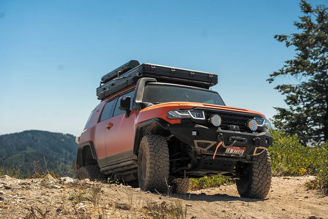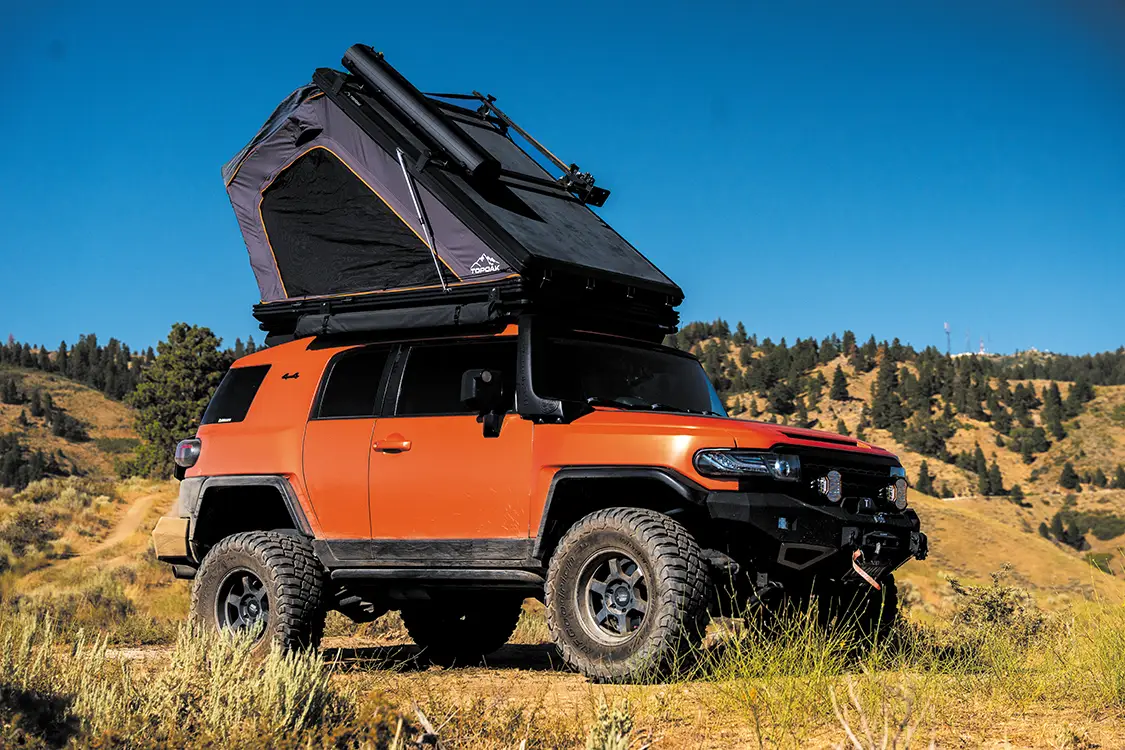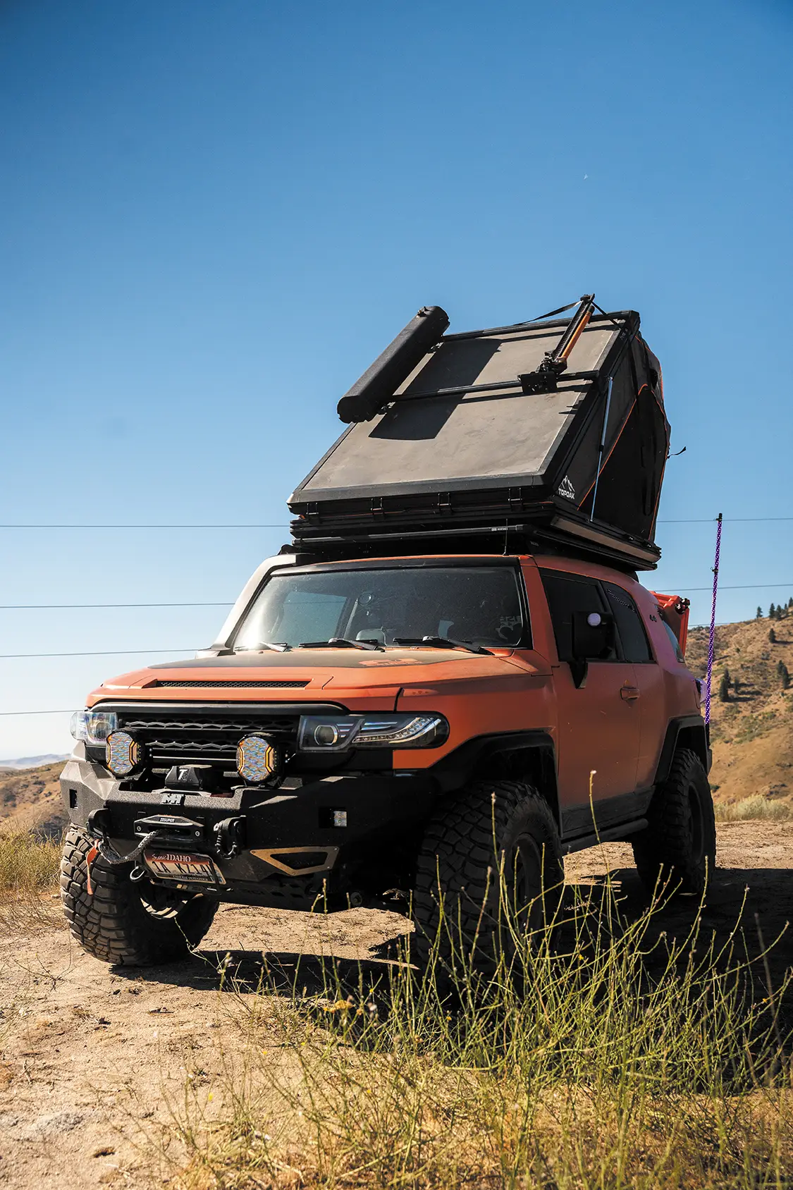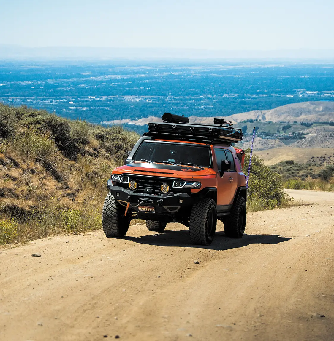 Our next challenge for the Garmin was to see how easily we could find a theoretical place to set up camp for the night. Using the Tread 2, we searched and filtered for nearby overnight camping locations, ultimately finding a spot midway down the mountain towards Boise. Once again, plotting a route to our new destination was quick and easy with the Garmin unit, and within a minute or two, we were on our way back down the mountain to our final stop for the day. Following fifteen minutes of on-road navigation down Bogus Basin Road, we rolled until the map told us to take a left turn onto an unpaved trail. We dropped off the pavement and onto the dirt once again, and the FJ made light work of the remaining trail to our camping spot. A short fast forward and a few minutes of light off-roading later, we pulled into a beautiful patch of land overlooking the entire Boise valley. The rest of the evening was as straightforward as the navigation getting there. Tad set up his rooftop tent, and we hung out atop our hilly campground while watching the sun set over the Treasure Valley. All in all, it was a good day of adventure, with dramatically fewer pauses to check a map.