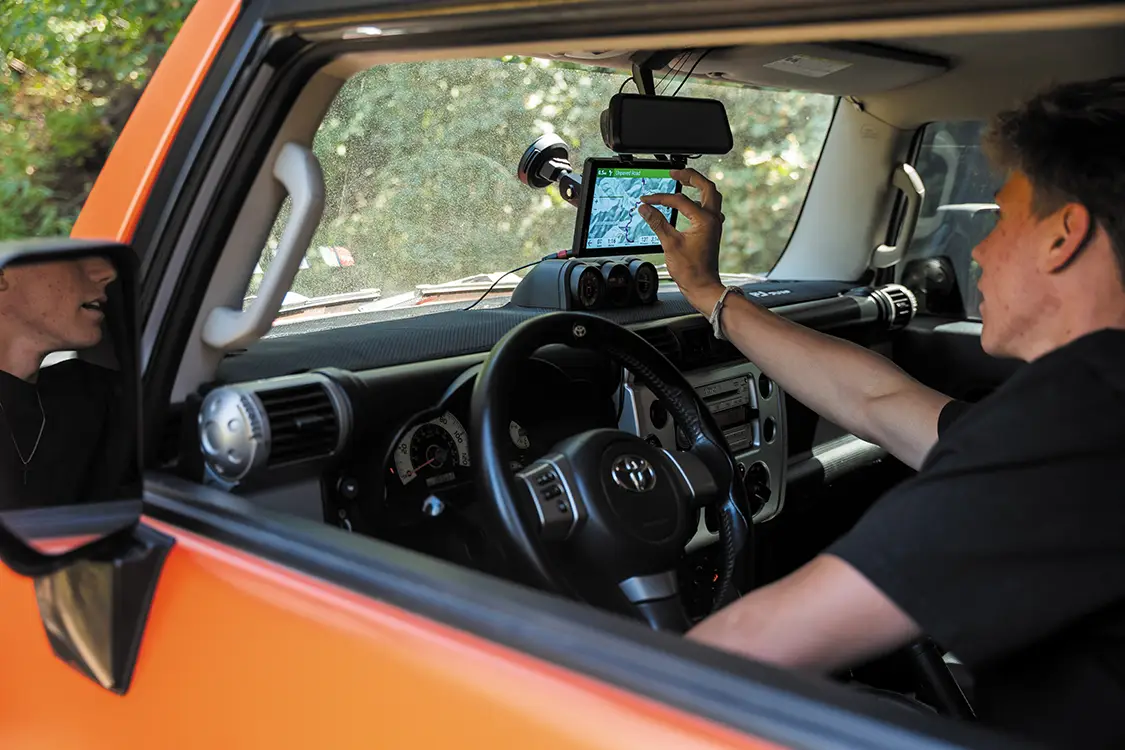 With the Tread 2 mounted (temporarily) on the windshield of the Cayenne, I made my way across the Boise valley towards downtown, where I met up with Tad Carlisle and his bright orange 2007 FJ Cruiser (@tcarguy on Instagram). From here, removing the Garmin from the Cayenne’s windshield and swapping it into the FJ took all of 30 seconds. Using the included power adapter and the genuine RAM mount, it was incredibly quick and easy to fit the display into the interior of the FJ (for anyone who owns an FJ Cruiser, this system fits perfectly between the gauges on top of the dash and the mirror).