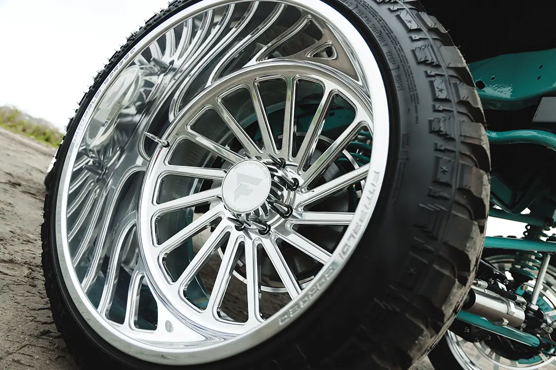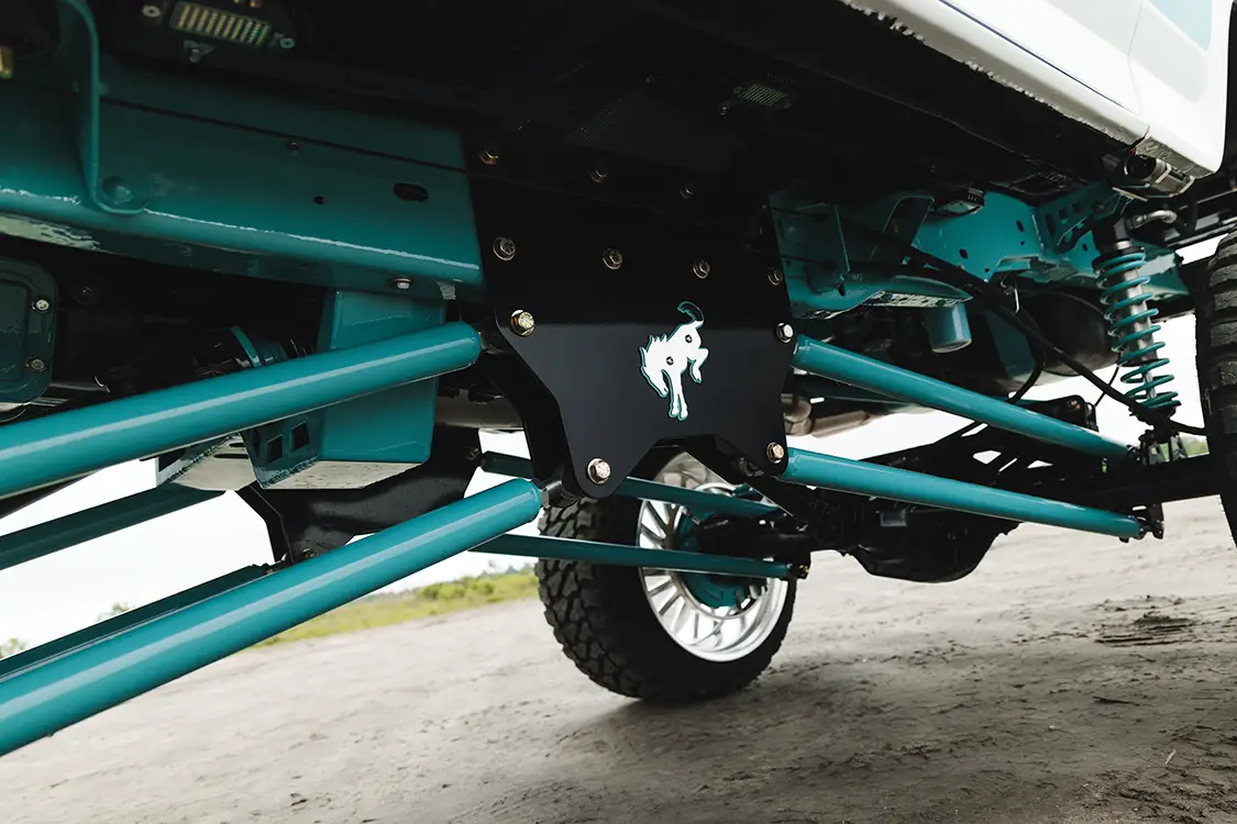 Next, Chelsey and Cory got to work building a custom 4-link kit, with an assist from Precision Laser Works. Together, this team fabricated custom shock mounts to the frame, a custom cradle, tubular-style bars with Heim joints at both ends, a one-off drag link, and a set of track bars. The axles were powdercoated black, and everything else was coated with Prismatic Powders Tropical Breeze, which set the tone for the remainder of the Bronco styling. Huge 26-inch Fittipaldi Off Road wheels with 38-inch Fury MT tires were soon slapped onto the heavily upgraded chassis, right as the next phase began.