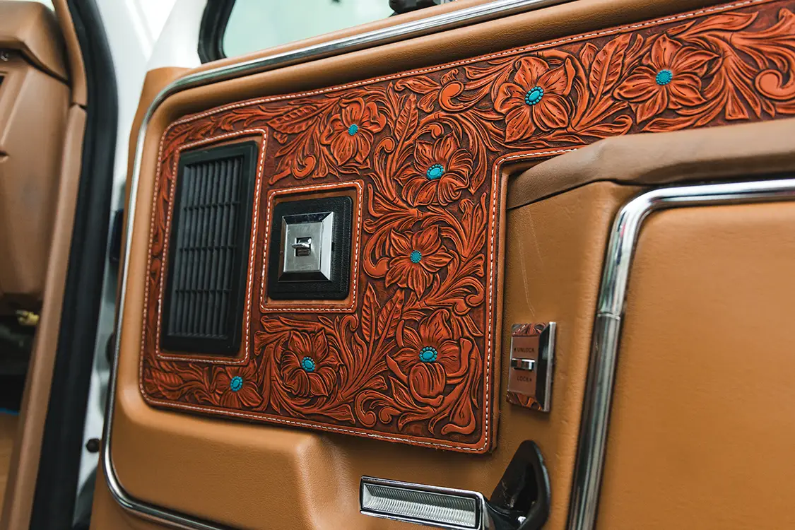 Hand-tooled leather door panels and center console lid by Doggone Leather Co., High River, Alberta, Canada