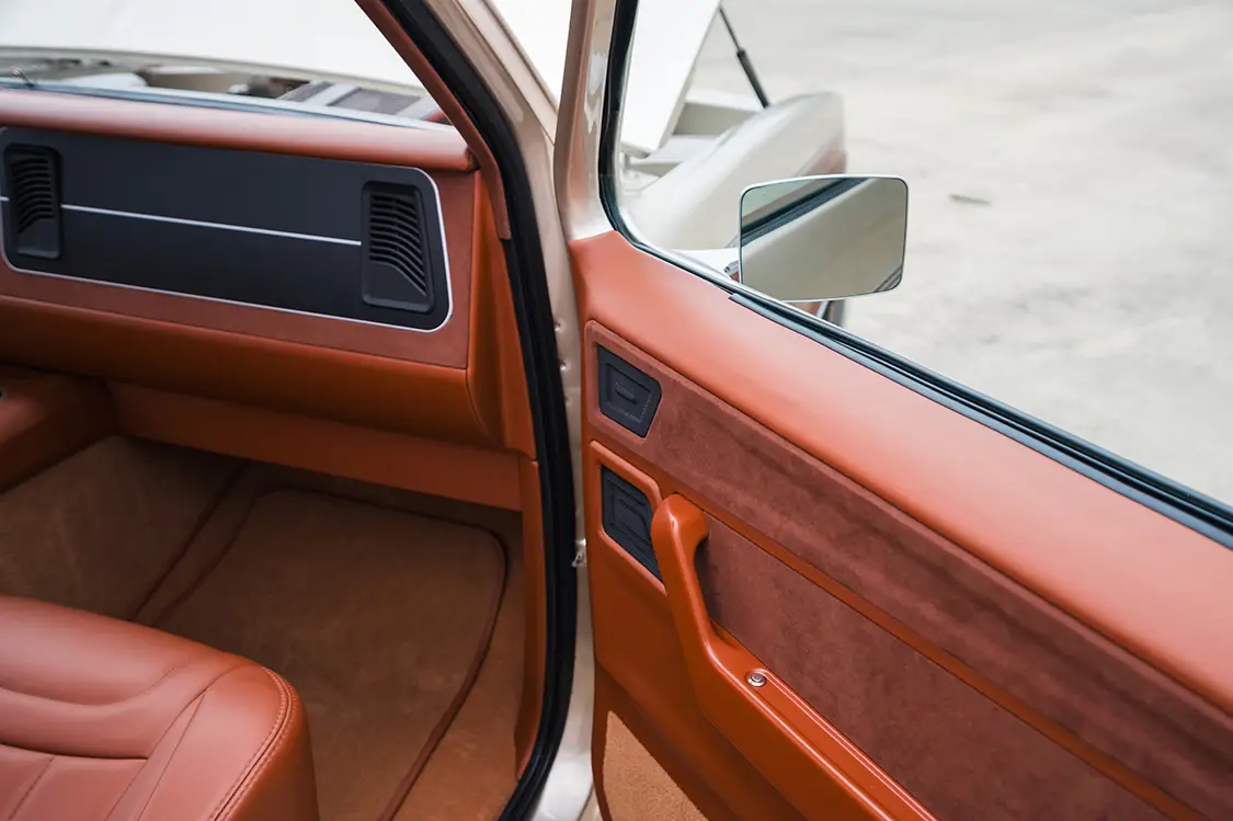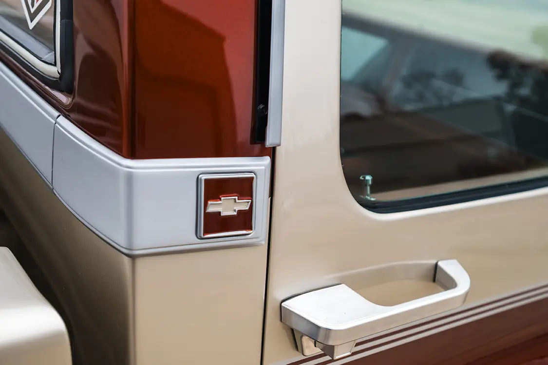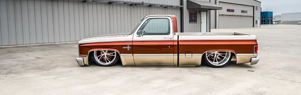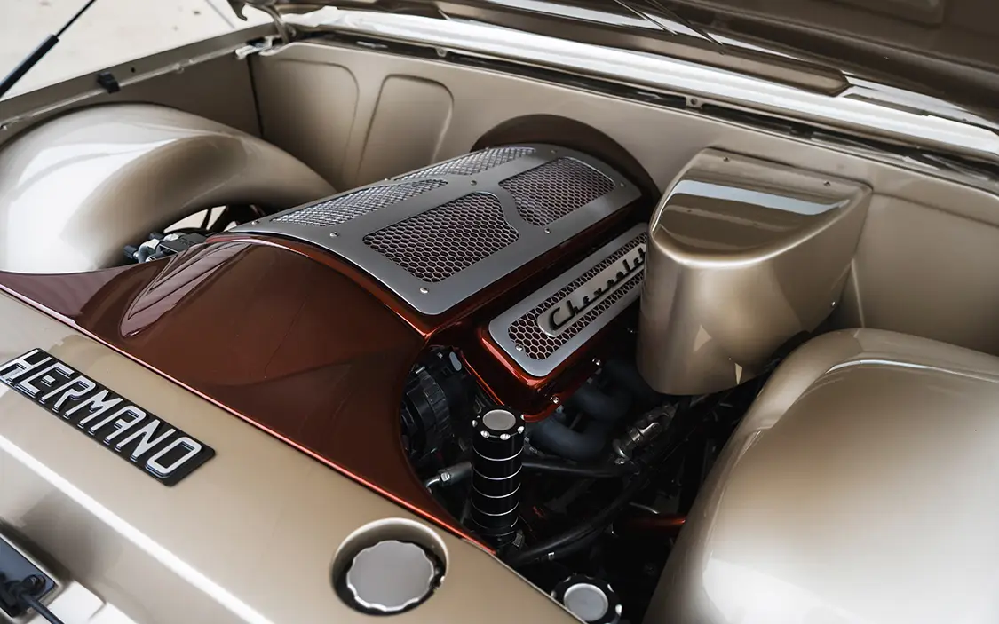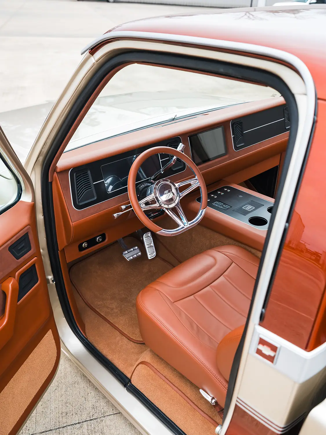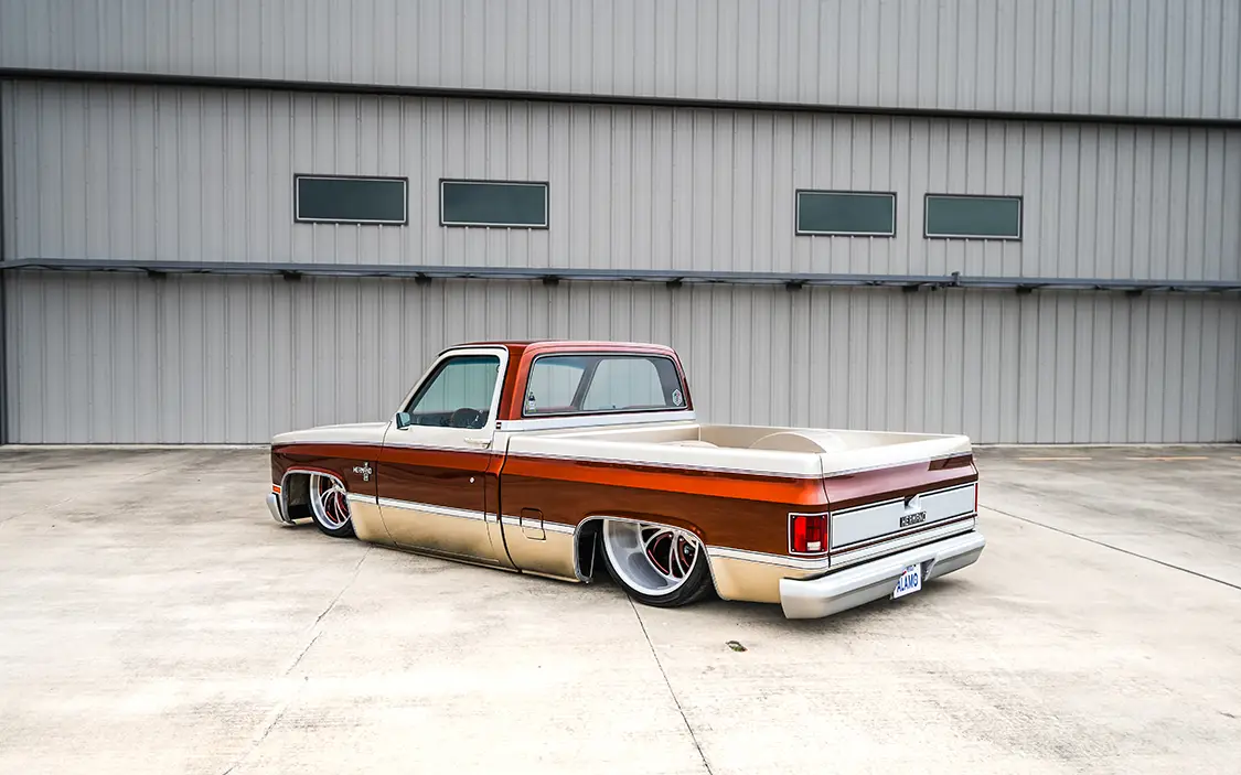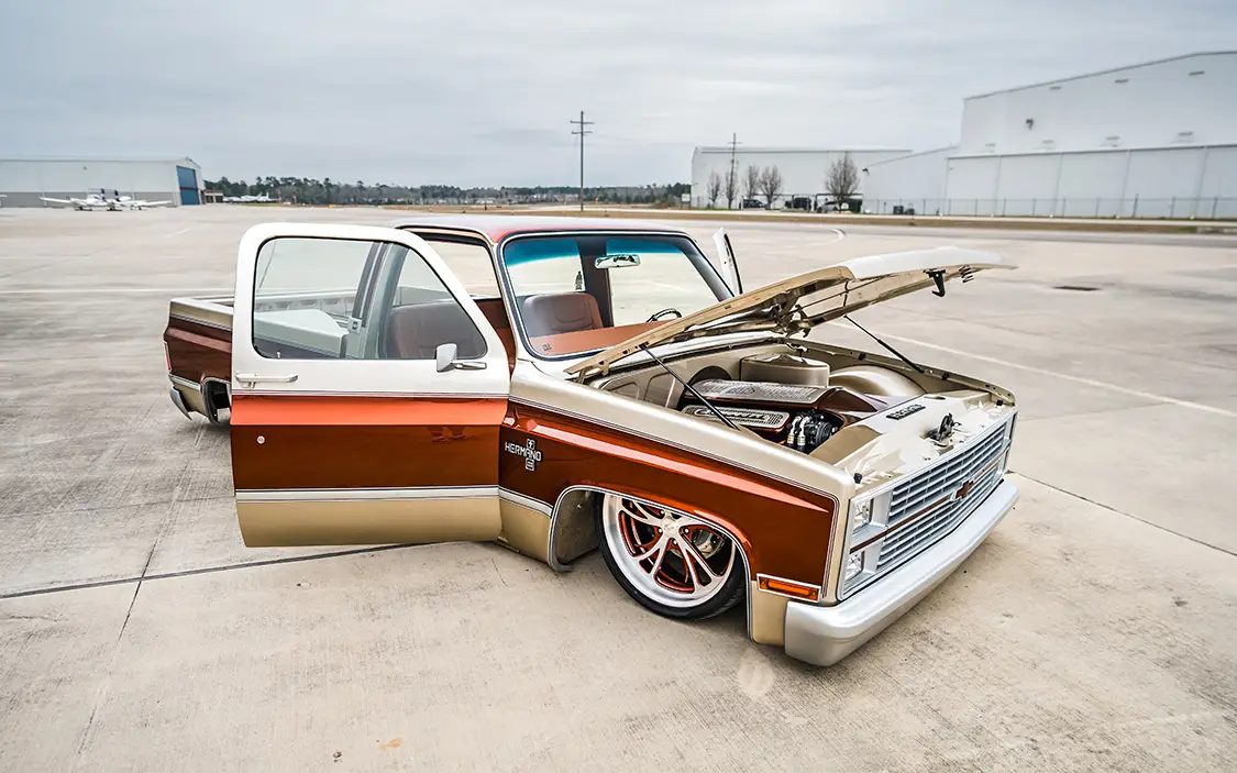 Four years deep and over $150k later, Hermano sits as one of the cleanest and most meaningful rides you’ll see at any show. The body mods are subtle but tight. Earl sourced a new front grille from LMC Truck, stepping it back a couple of years with a 1984 Chevy C10 look. Both bumpers got tucked and shaved for a tighter fit, and fresh front and rear lighting from United Pacific brings it all together. When it came time to paint, Earl let his wife, Ami, make the call. She chose tan with candy orange from Robert Meza at Alamo Customs in Alvin, Texas—a solid choice of both paint and painter.
