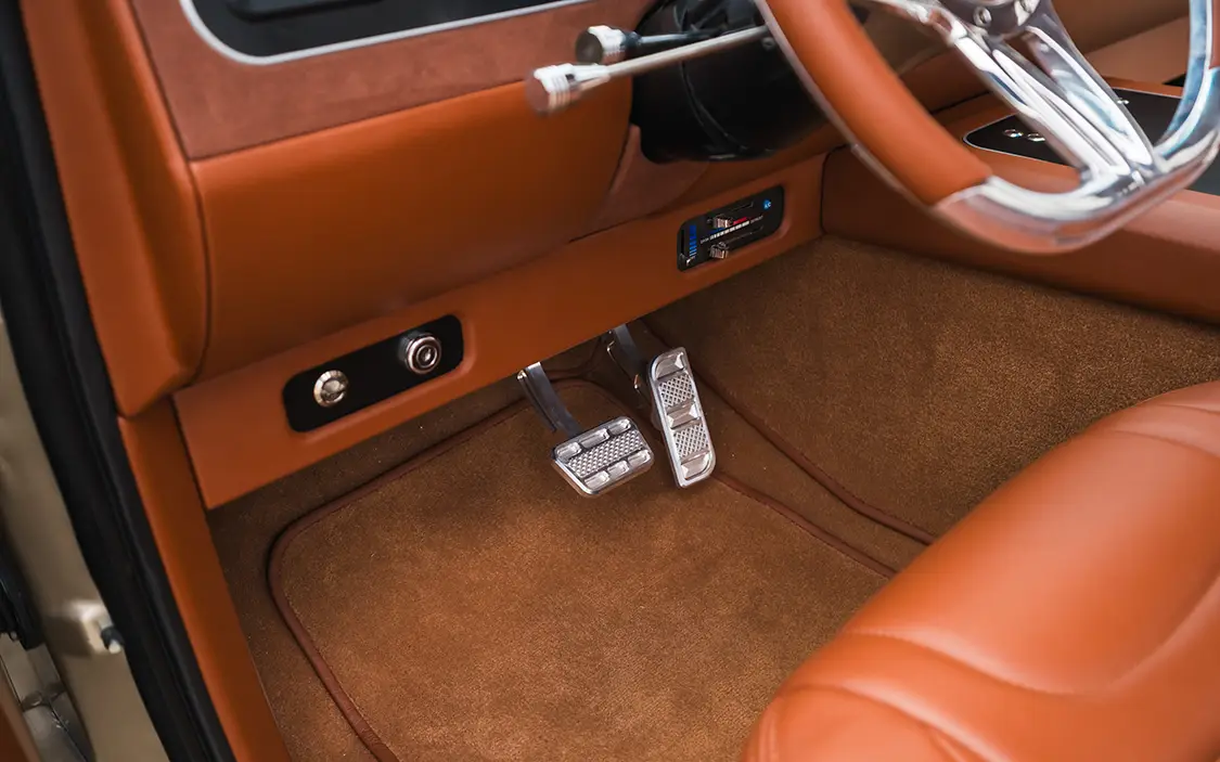 Stopping power comes from Classic Performance Products front and rear disc brakes pushed by a Wilwood master cylinder and hydroboost. Underneath, the full custom Acme chassis is boxed and bagged at all four corners for that laid-out look and smooth ride.
