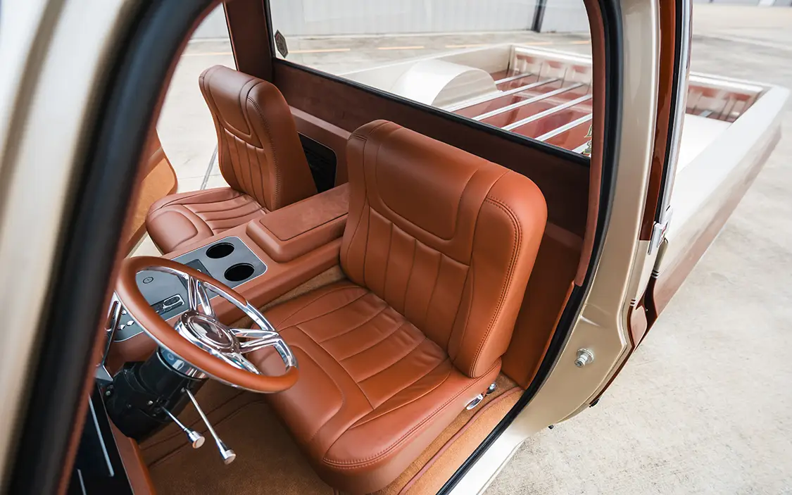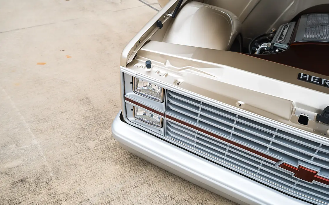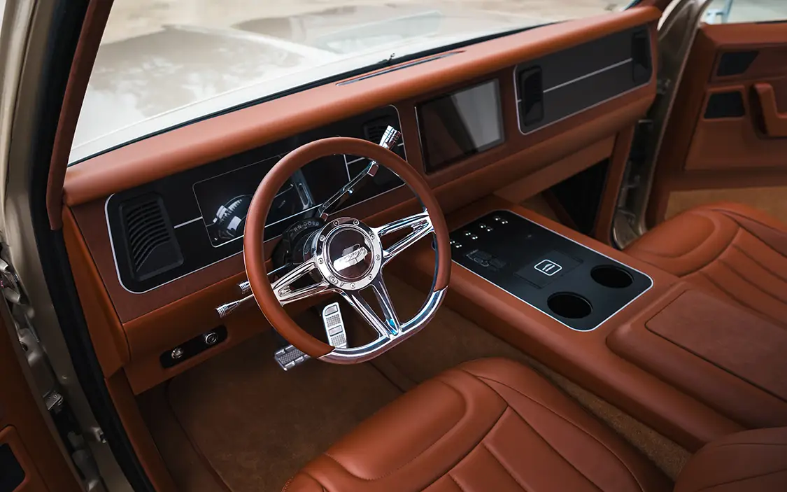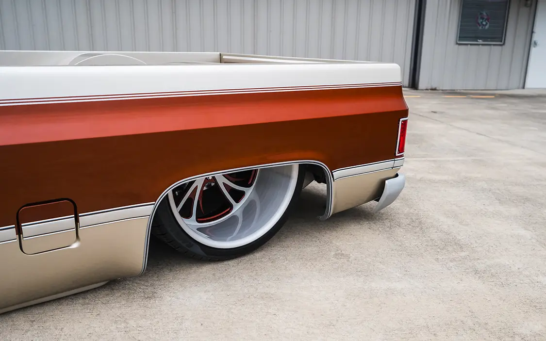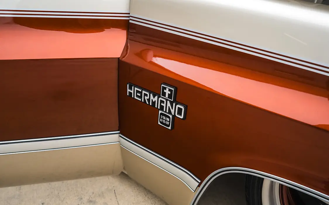 Four years deep and over $150k later, Hermano sits as one of the cleanest and most meaningful rides you’ll see at any show. The body mods are subtle but tight. Earl sourced a new front grille from LMC Truck, stepping it back a couple of years with a 1984 Chevy C10 look. Both bumpers got tucked and shaved for a tighter fit, and fresh front and rear lighting from United Pacific brings it all together. When it came time to paint, Earl let his wife, Ami, make the call. She chose tan with candy orange from Robert Meza at Alamo Customs in Alvin, Texas—a solid choice of both paint and painter.