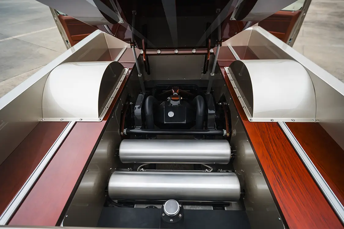 Stopping power comes from Classic Performance Products front and rear disc brakes pushed by a Wilwood master cylinder and hydroboost. Underneath, the full custom Acme chassis is boxed and bagged at all four corners for that laid-out look and smooth ride.
