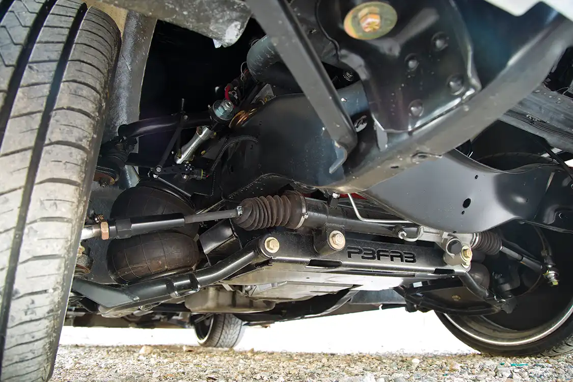 Omar’s C-10 is a bolt-by-bolt custom. Like all things that are well built, a solid foundation was developed first. The truck sports a full custom chassis with Porterbuilt components that still makes room for a narrowed rearend. The custom chrome-moly axles channel power from the 4.10 gears to the massive custom rear wheels. The rear suspension configuration is a team effort among Porterbuilt suspension, Ridetech shocks and Air Lift Dominator airbags. A similar arrangement makes the equally dramatic front drop possible and deploys custom Porterbuilt control arms.