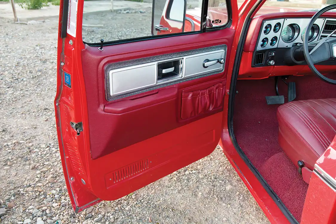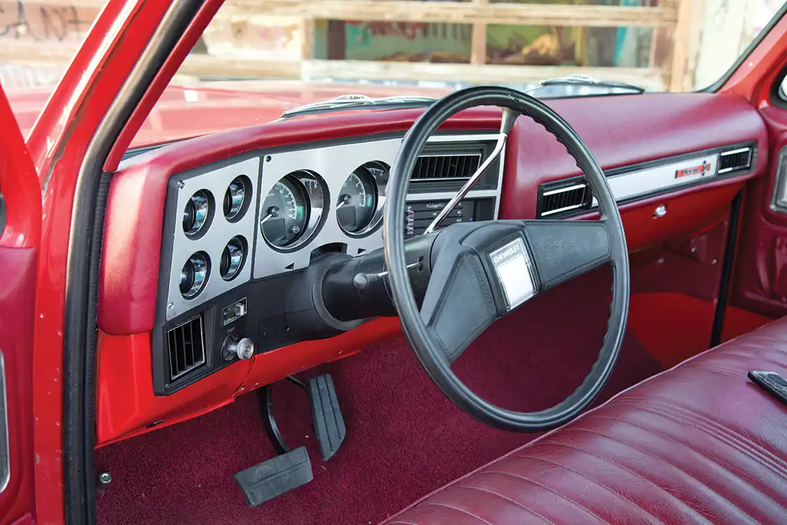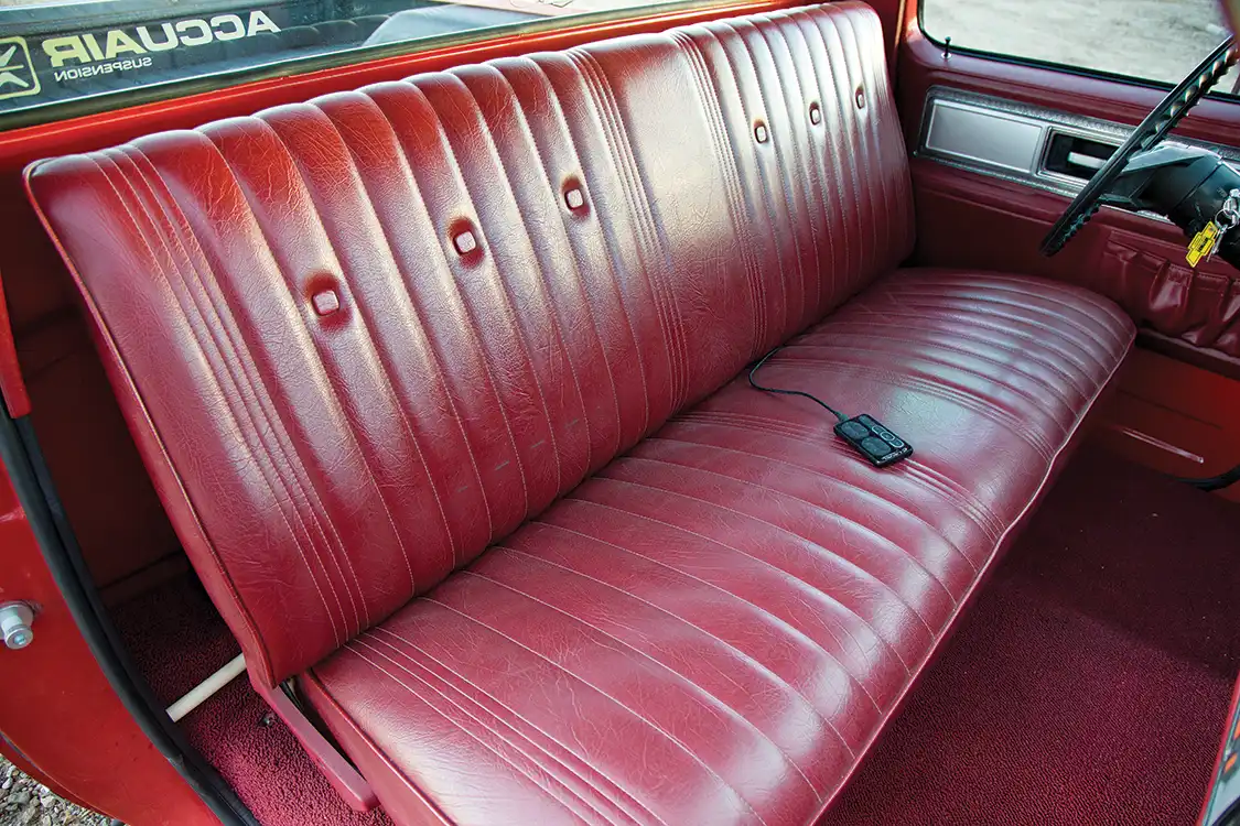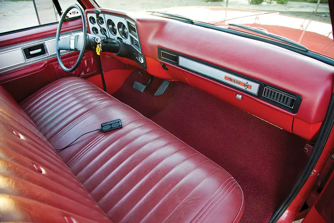 Working with the original styling of the rest of Omar’s truck, the interior was adorned with custom red carpet and upholstery. Victor’s Upholstery began with the original bench seat, wrapping it in period-correct crimson leather. The dash was wrapped to match as well, effortlessly complementing the modern touches. The dash displays crucial information via Dakota Digital gauges, which are housed in a brushed stainless steel bezel. Vintage Air AC is monitored using the factory climate control switches. The factory door handles, panels and headliner round out the interior.