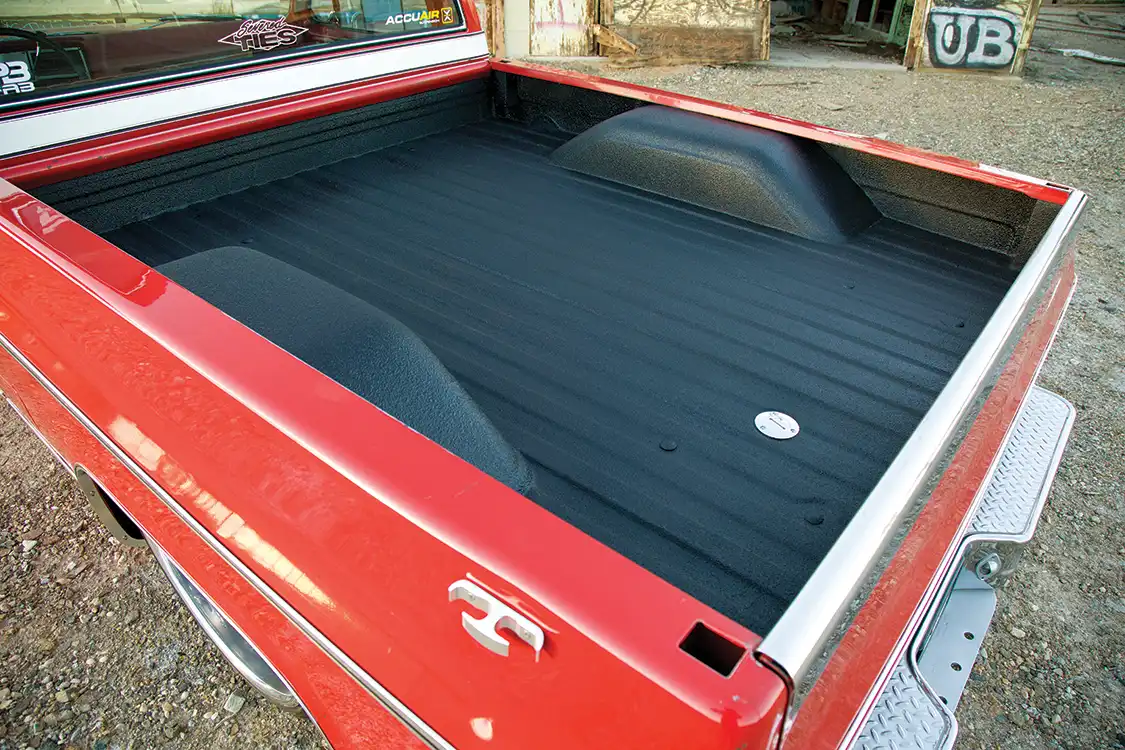 Next, the truck was finish-prepped. Under the hood high gloss black acts as a mirrored surface to show off the sheet metal and motor. The bed was sprayed with LINE-X for classic styling and utility. The factory exterior Coronado Red was kept intact.