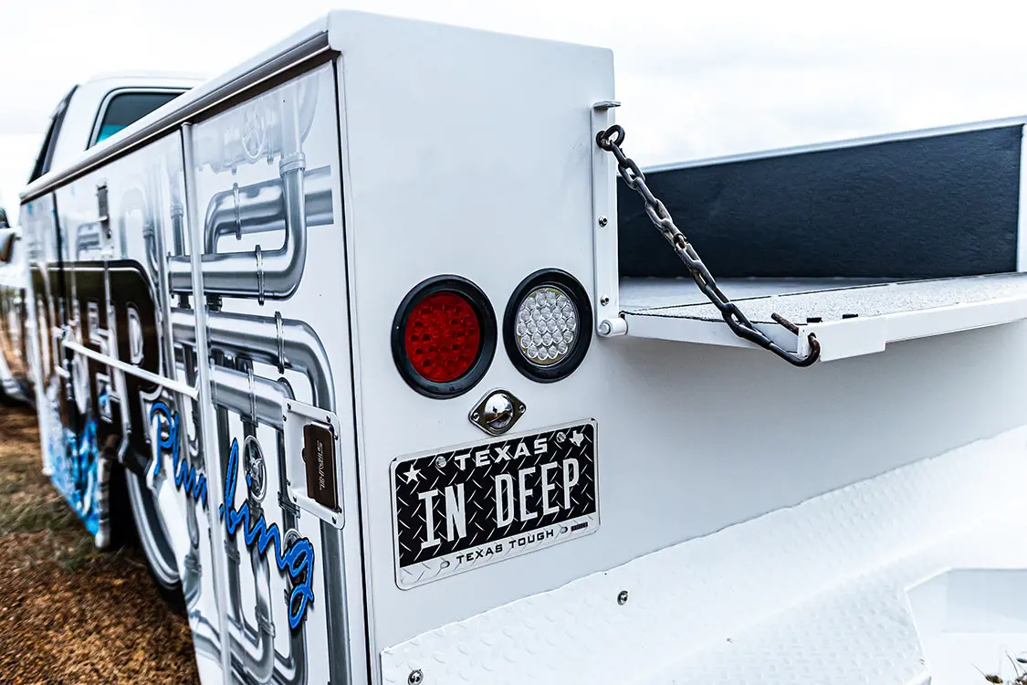 Jarrod scored an outrageously sweet deal scooping this truck up. Don’t get too jealous, but he found it on the side of the road for just $800 after it was repo’d. It wasn’t in too bad of shape, but obviously needed some work. He and his buddies went through the whole thing frame-up, fixing the utility bed and getting it ready to rep his plumbing company—In 2 Deep.