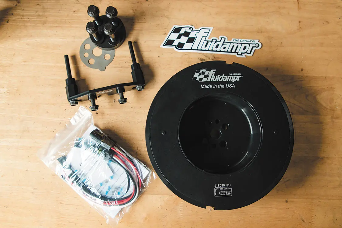 This kit includes the damper itself (part #960311), full power kit with extended bolts (part #300008) , and the crank sensor relocation kit (part #300003). Make sure you have a powerful ½-inch impact and/or a barring tool to keep your crank from spinning over, and a torque wrench to finish the project.