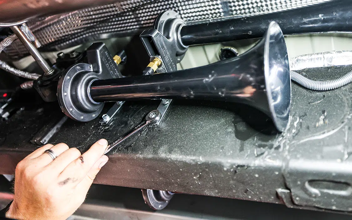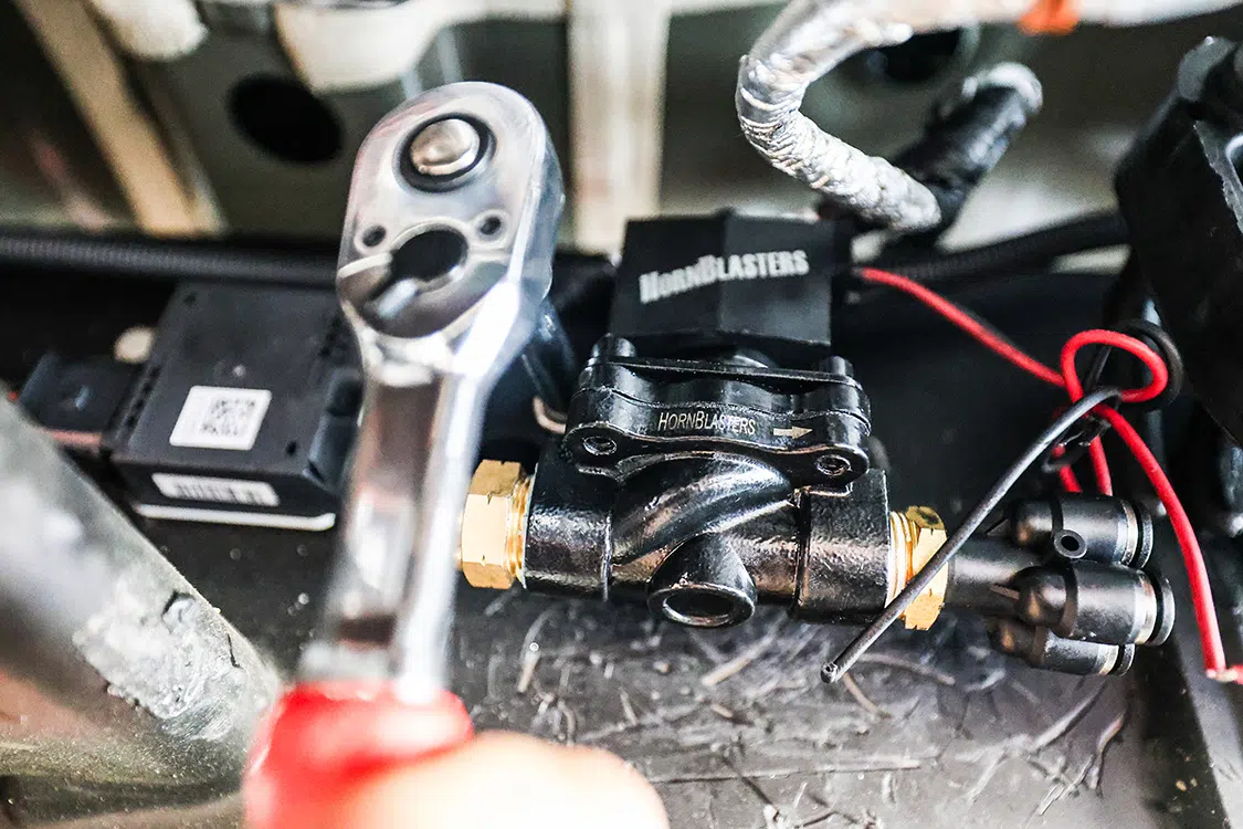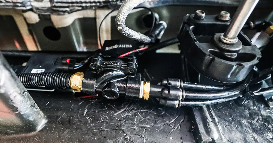 One of the advantages of adding an onboard air system is that you can also add a set of train horns. Not only do train horns provide added safety, but they also add a ton of fun scaring your friends and innocent bystanders. Honestly, train horns are always one of my favorite parts to any vehicle. For that, I got with Horn Blasters and picked up one of its Shocker XL train horn kits. This kit gives you four trumpets, the valve, fittings, and air line needed.