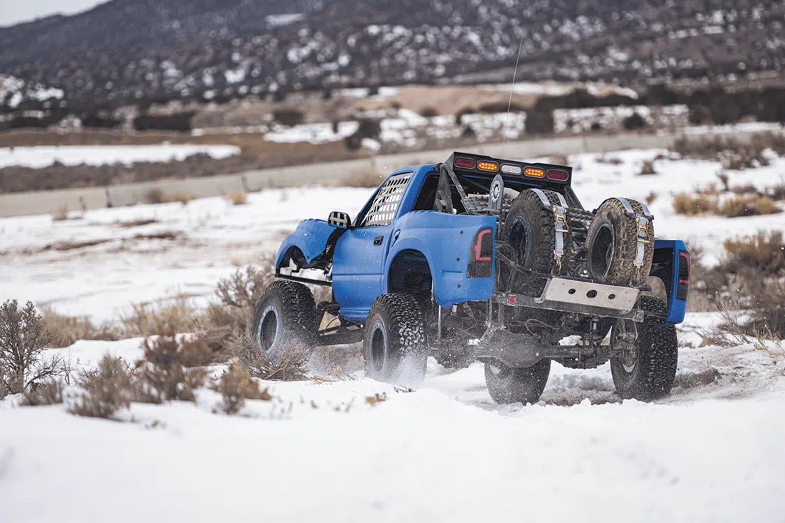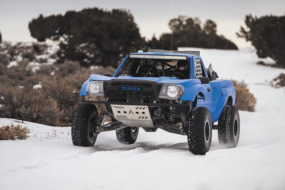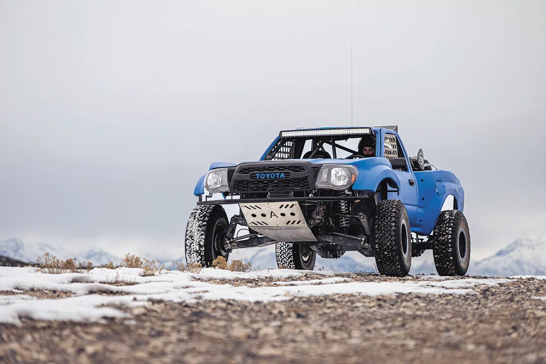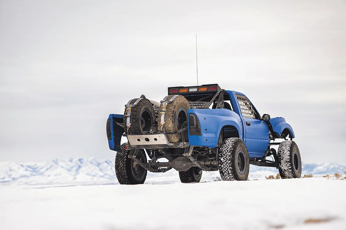 EXTERIOR ACCESSORIES: 2014 stock Tacoma grille; 2014 Tacoma fiberglass hood, one piece from McNeil Fiberglass; 2014 Tacoma headlights; Smoked 2014 Tacoma taillights; Rigid 40-inch dual row light bar mounted to front roof; Custom chase bar mounted on rear roll cage; 16-gallon fuel cell gas tank with Holley 10 and 100-micron fibers and a 175-psi pump; Custom front tube bumper; Custom aluminum front, belly, and rear skid plates; Custom VooDoo Blue bed liner paint; Full 2nd-gen Tacoma swap for front and rear glass, custom headlights, and grille mounts
