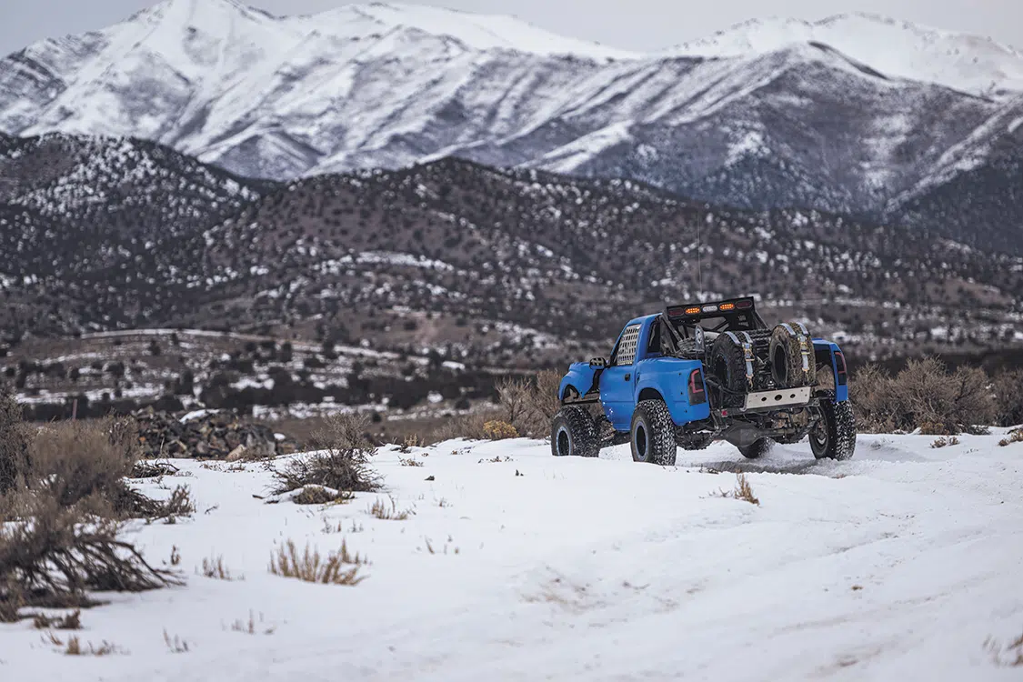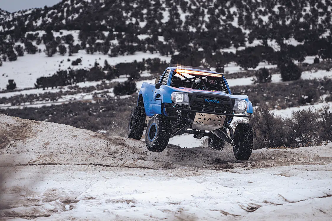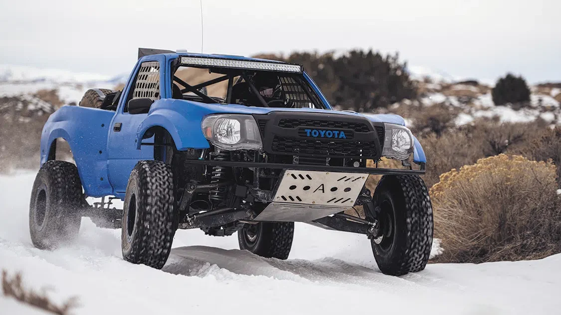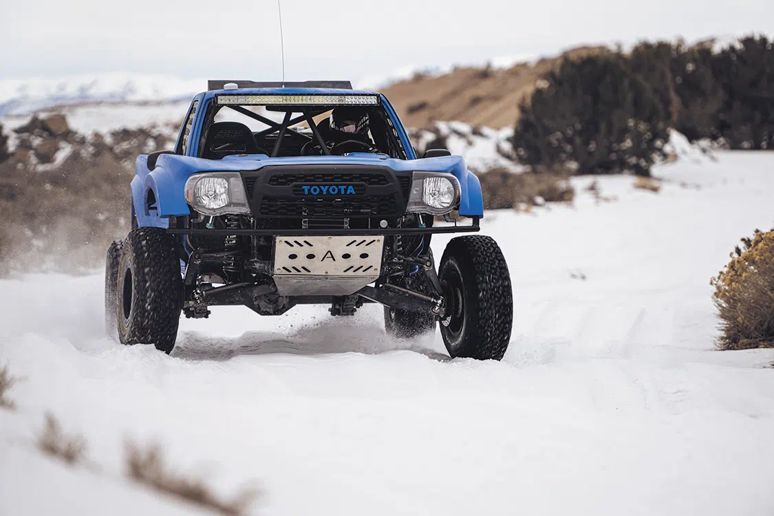EXTERIOR ACCESSORIES: 2014 stock Tacoma grille; 2014 Tacoma fiberglass hood, one piece from McNeil Fiberglass; 2014 Tacoma headlights; Smoked 2014 Tacoma taillights; Rigid 40-inch dual row light bar mounted to front roof; Custom chase bar mounted on rear roll cage; 16-gallon fuel cell gas tank with Holley 10 and 100-micron fibers and a 175-psi pump; Custom front tube bumper; Custom aluminum front, belly, and rear skid plates; Custom VooDoo Blue bed liner paint; Full 2nd-gen Tacoma swap for front and rear glass, custom headlights, and grille mounts