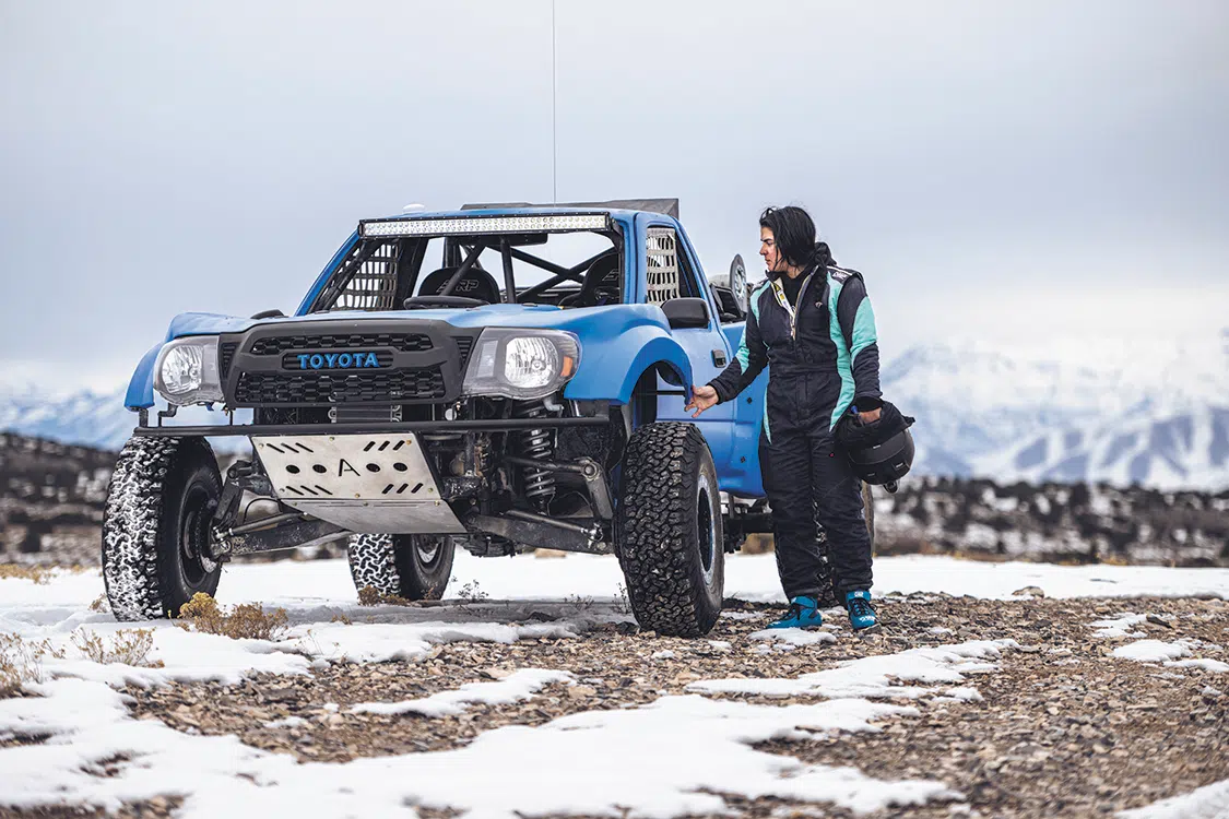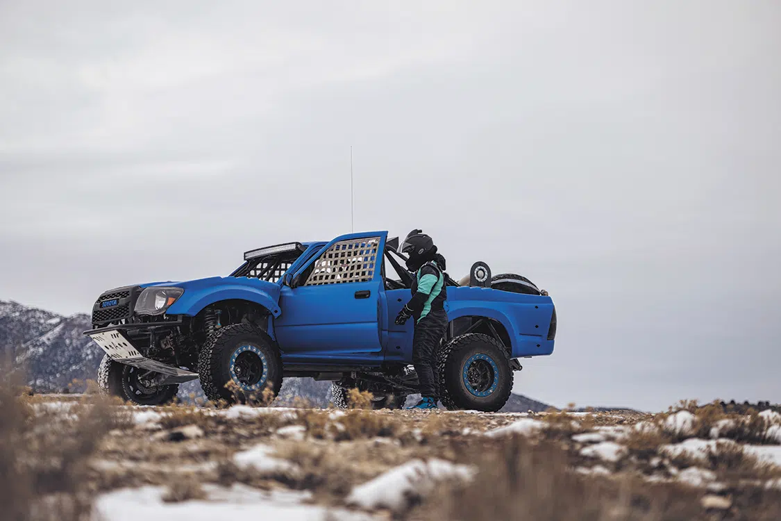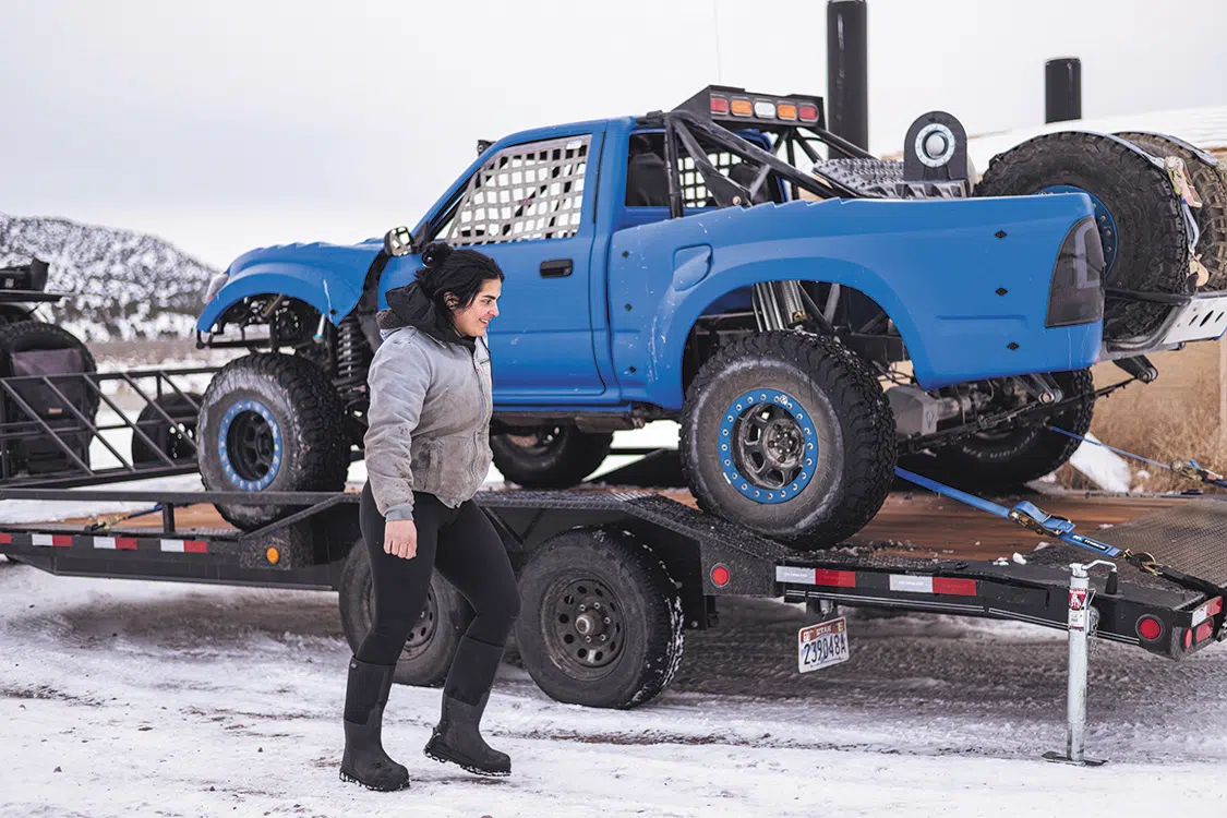 Her 1993 Toyota Pickup is the perfect storm of off-road power and race mechanics. It stands proud on 33-inch tires at a whopping 88 inches wide with bright VooDoo blue paint – you seriously can’t miss it when she and her crew roll up. “The truck is completely built for races,” says Symons, who, after buying the Pickup off Facebook Marketplace, built it herself from the ground up.