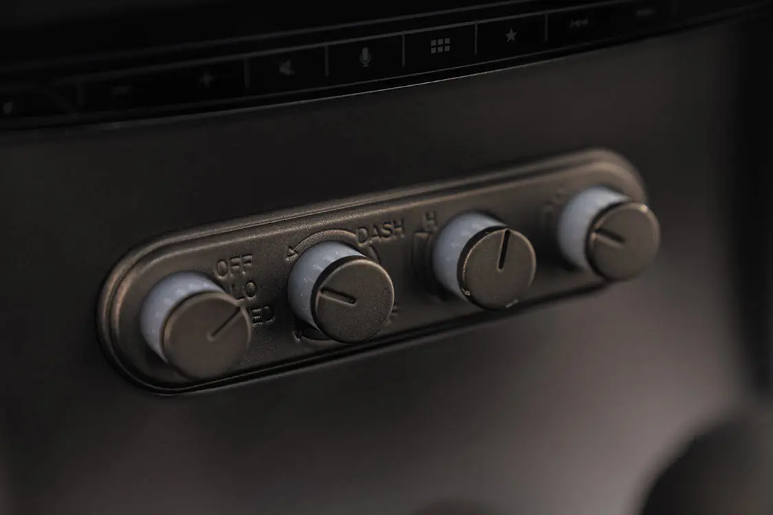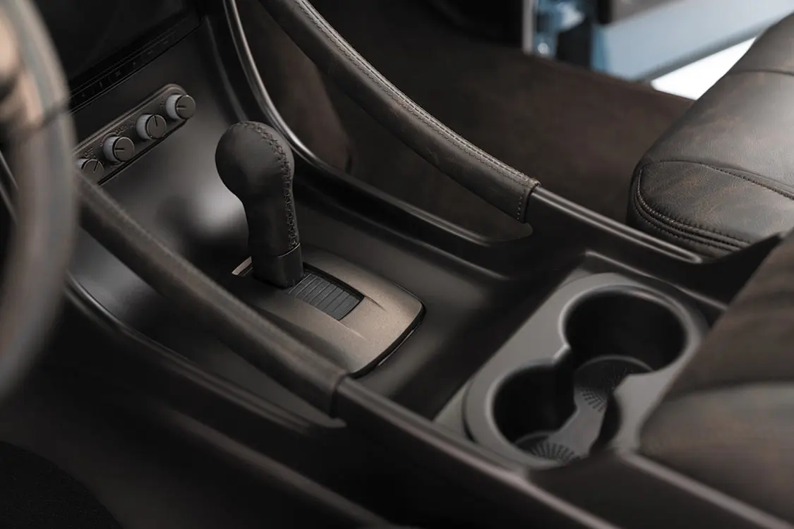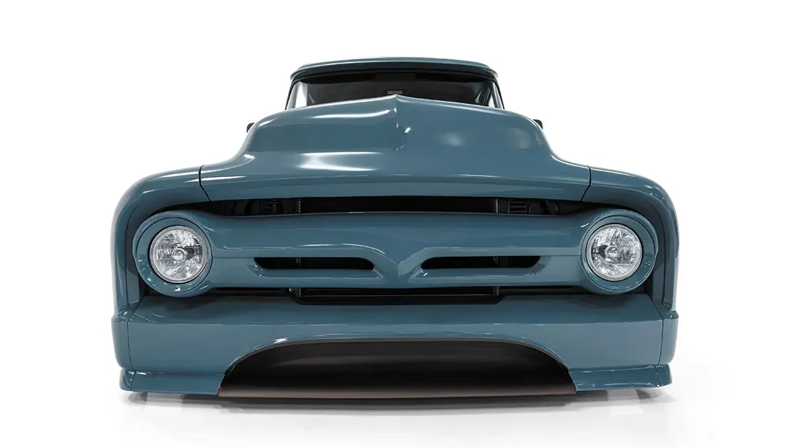 The owner of the F-600 selected Area 51 Blue—a factory Ford paint color to cover the exterior of the of the truck. Even though the hue is a more contemporary selection used on late-model Bronco and pickups, it looks right at home on the ’56. Soon after the paint dried and the multiple layers of clearcoat were buffed to a mirror-like shine, fabrication and interior work immediately began within the confines of the newly expanded cab. Scott and Mark fabricated a custom center console and metal dash with an opening designed specifically to house a Dakota Digital gauge cluster. A custom bronze paint was then used to cover the dash, upper halves of the inner doors and pillars, as well as the console, steering wheel, and so many other smaller accessories.