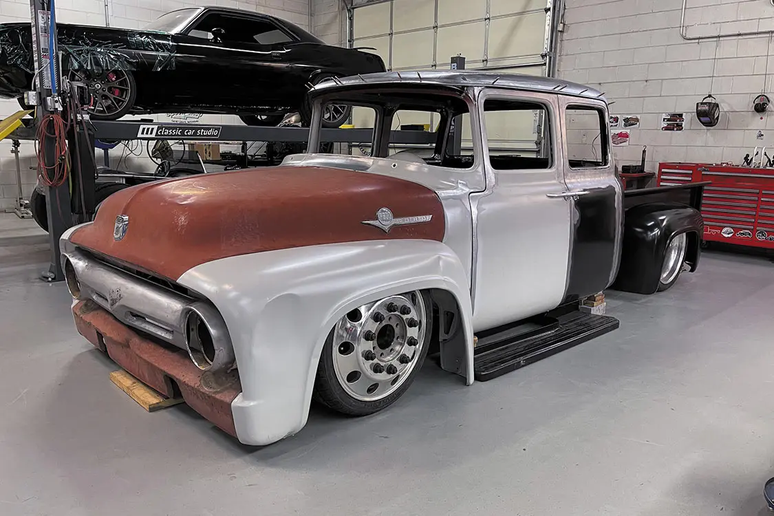 The factory chassis had served the F-600 well throughout its years of dedicated labor, but so much more was in store for it with its scheduled reincarnation. Once the OE frame was removed from under the cab, it was loaded on the first truck headed to the scrapyard. CCS resident fabrication gurus Scott France and Mark Siddle designed an all-new, one-off foundation for the Ford that features a front Porterbuilt dropmember sub-frame complete with tubular control arms and Detroit Speed rack-and-pinion steering. The back of the chassis was outfitted with a Porterbuilt 4-link kit as well as a narrowed 14-bolt rearend. Air ride was always in the cards for this project, and to allow the ’56 to boast a fully adjustable ride height, Goodyear ‘bags along with Accuair air-management components and Viair compressors were properly plumbed and wired.