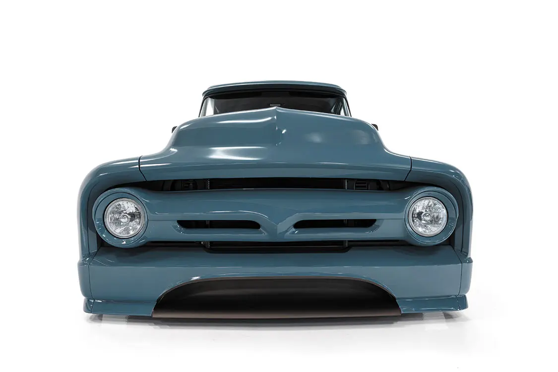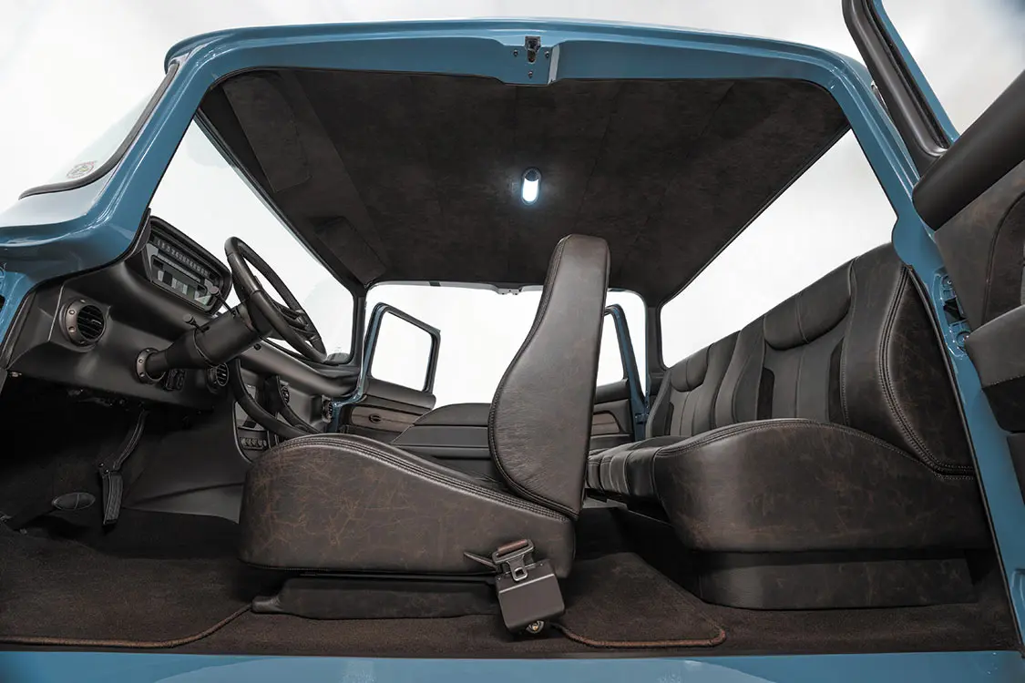 The owner of the F-600 selected Area 51 Blue—a factory Ford paint color to cover the exterior of the of the truck. Even though the hue is a more contemporary selection used on late-model Bronco and pickups, it looks right at home on the ’56. Soon after the paint dried and the multiple layers of clearcoat were buffed to a mirror-like shine, fabrication and interior work immediately began within the confines of the newly expanded cab. Scott and Mark fabricated a custom center console and metal dash with an opening designed specifically to house a Dakota Digital gauge cluster. A custom bronze paint was then used to cover the dash, upper halves of the inner doors and pillars, as well as the console, steering wheel, and so many other smaller accessories.