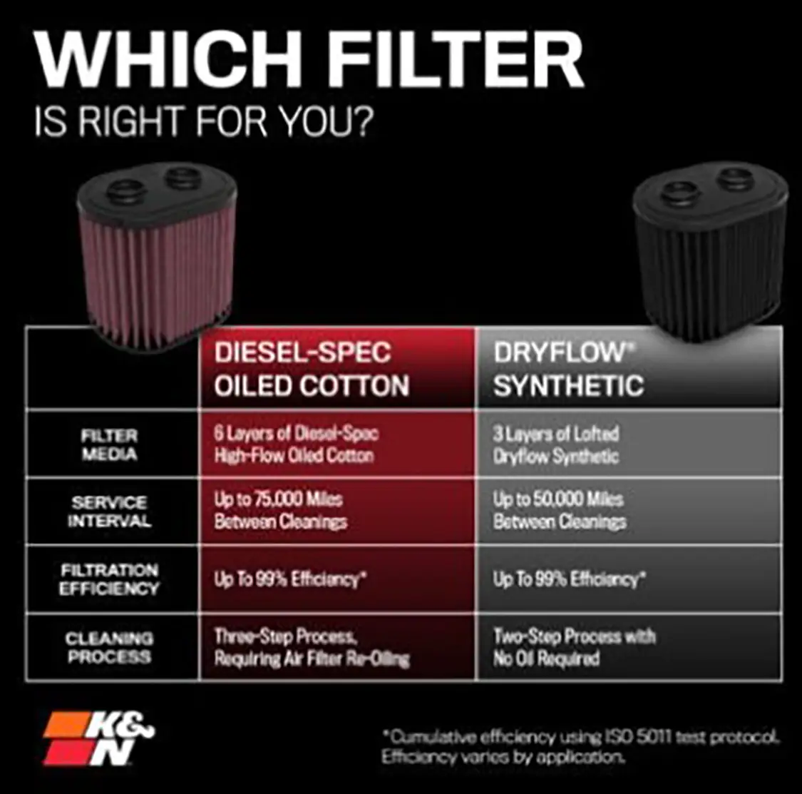 All K&N NextGen Performance Diesel air intake systems are equipped with Dryflow Air Filters, featuring advanced dry synthetic filter media designed to increase horsepower, acceleration, and towing performance. Washable and reusable, Dryflow filters provide up to 50,000 miles of filtration between cleanings, making them one of the quickest and most cost-effective performance upgrades available for diesel trucks. Both Dryflow and traditional K&N High-Flow Air Filters are also available as drop-in panel replacements for factory airboxes.