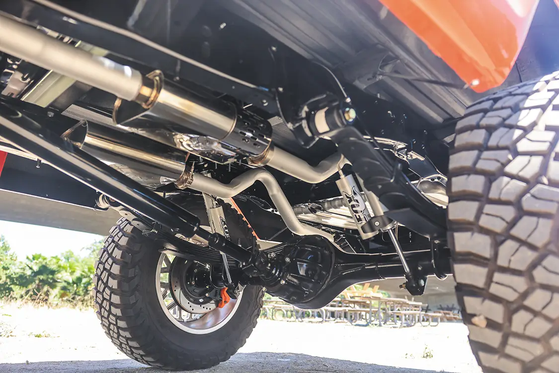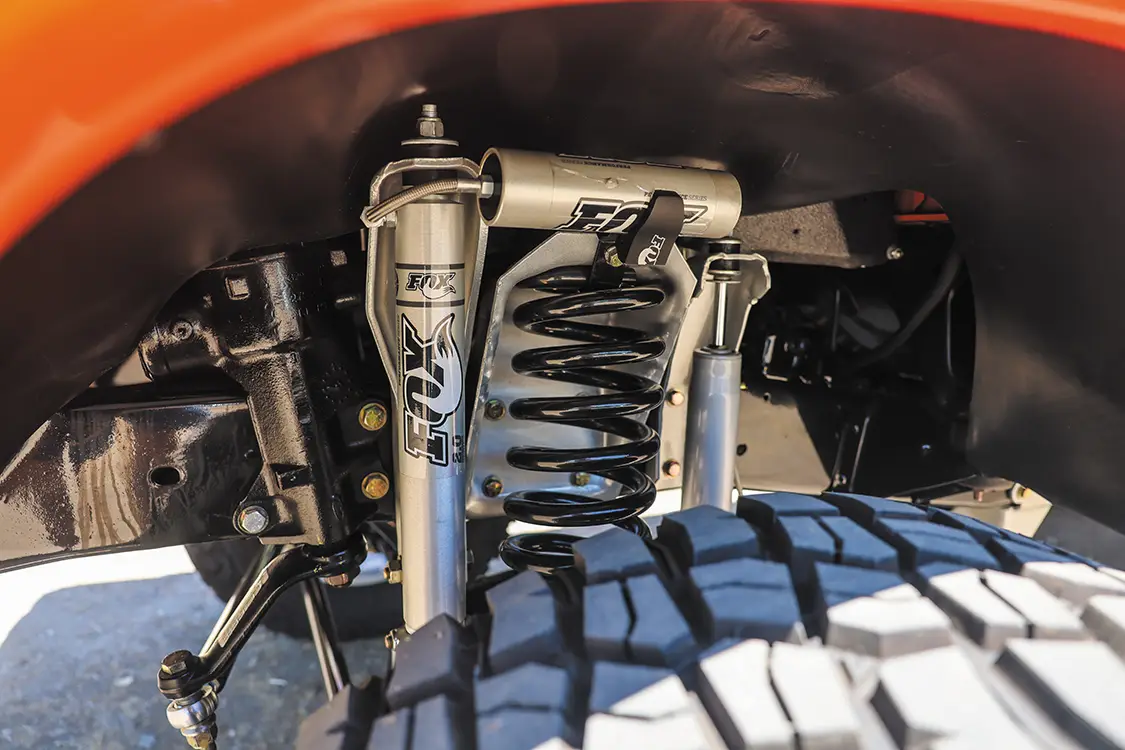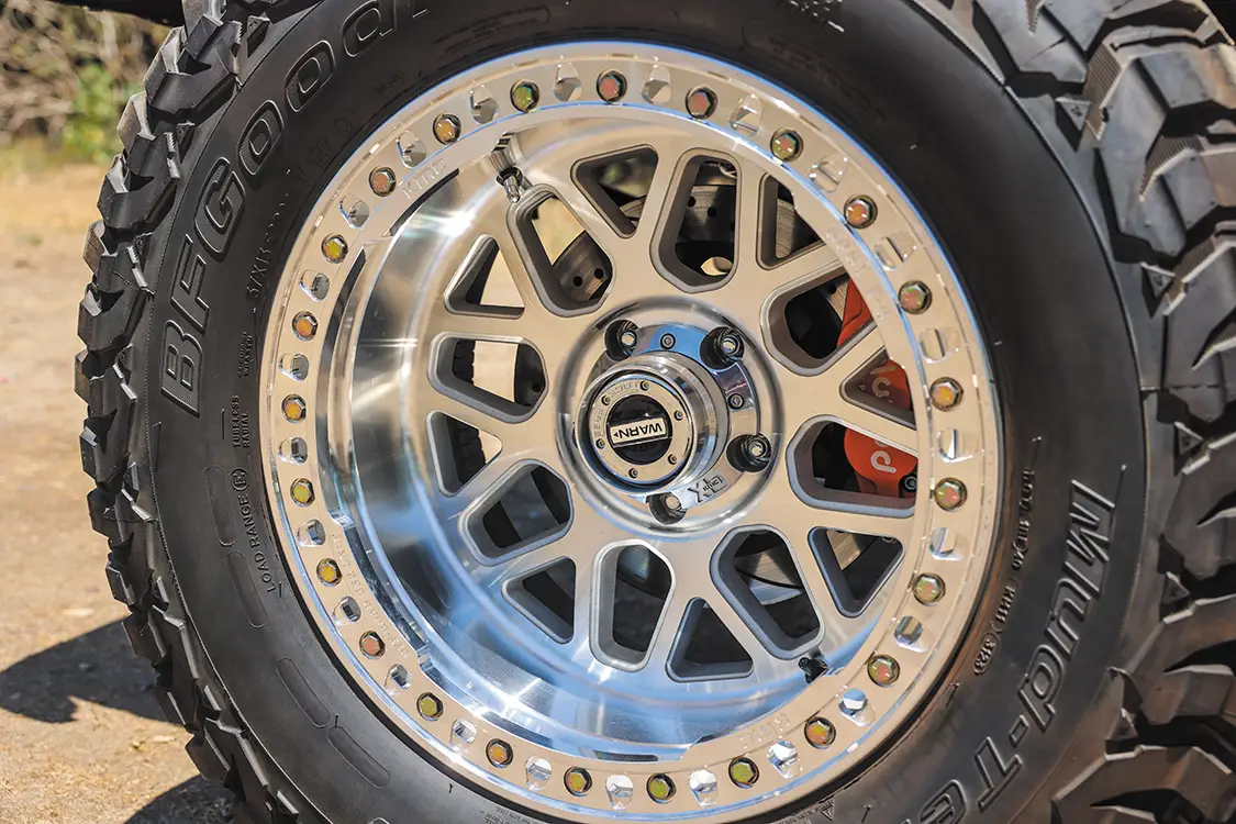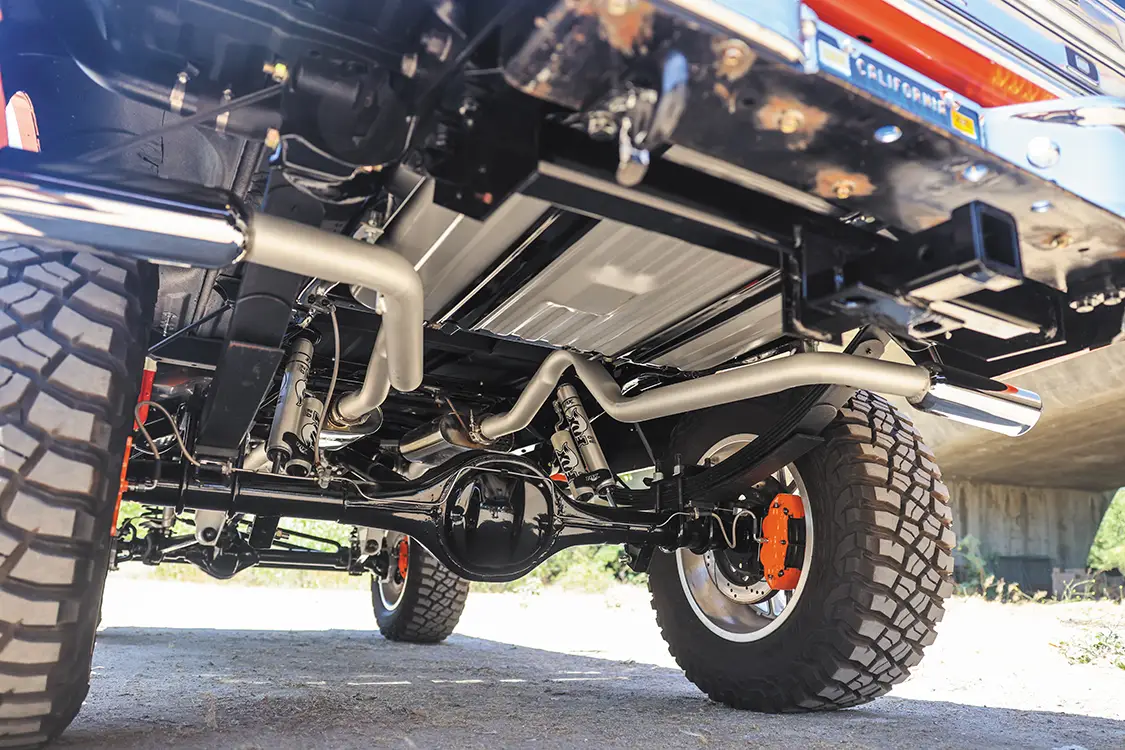 The suspension is handled by Rancho and Fox with a 6-inch lift that allows the truck to sit just right on 37×13.50×20 BFGoodrich Mud Terrain tires. Special-ordered KMC 5-lug 3-piece wheels tuck perfectly under the factory-original wheel wells, creating a muscular stance that matches its capability.