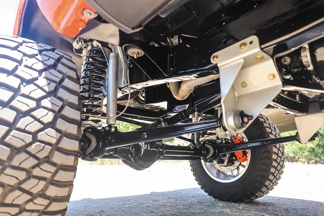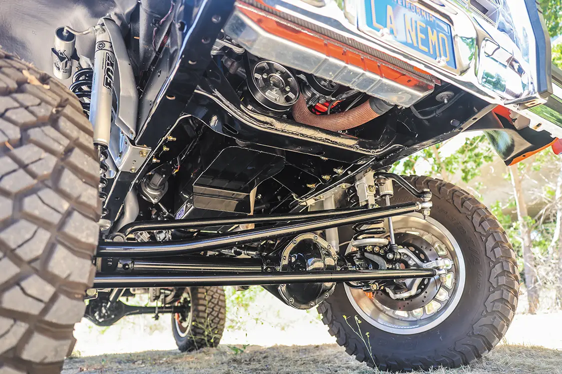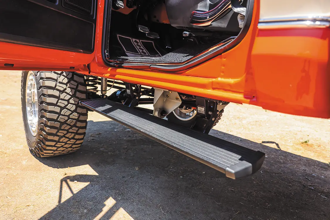 Other off-road-ready touches include 6-piston Wilwood disc brakes, Fox 2.0 shocks, Warn hubs, a Painless wiring harness, dual KC HiLites Daylighters on a Go Rhino single double chrome roll bar, Amp Research electric side steps, and even custom undercoating with painted axles. Everything has been thoughtfully chosen to create a showstopper that’s equally at home on the trail or on the boulevard.